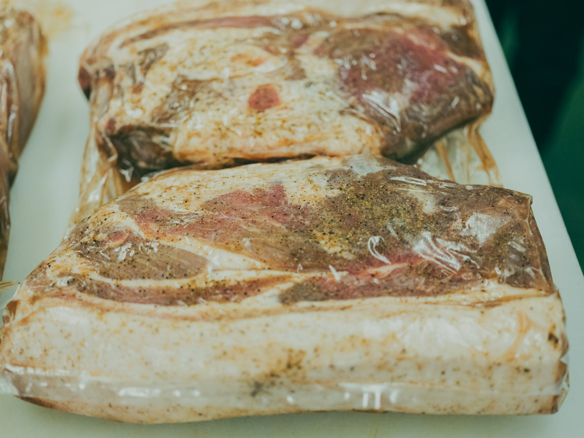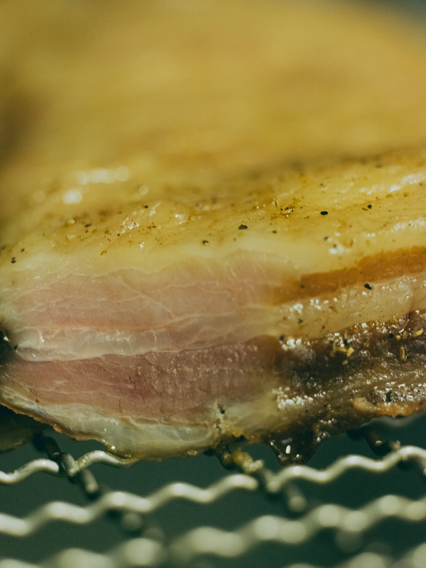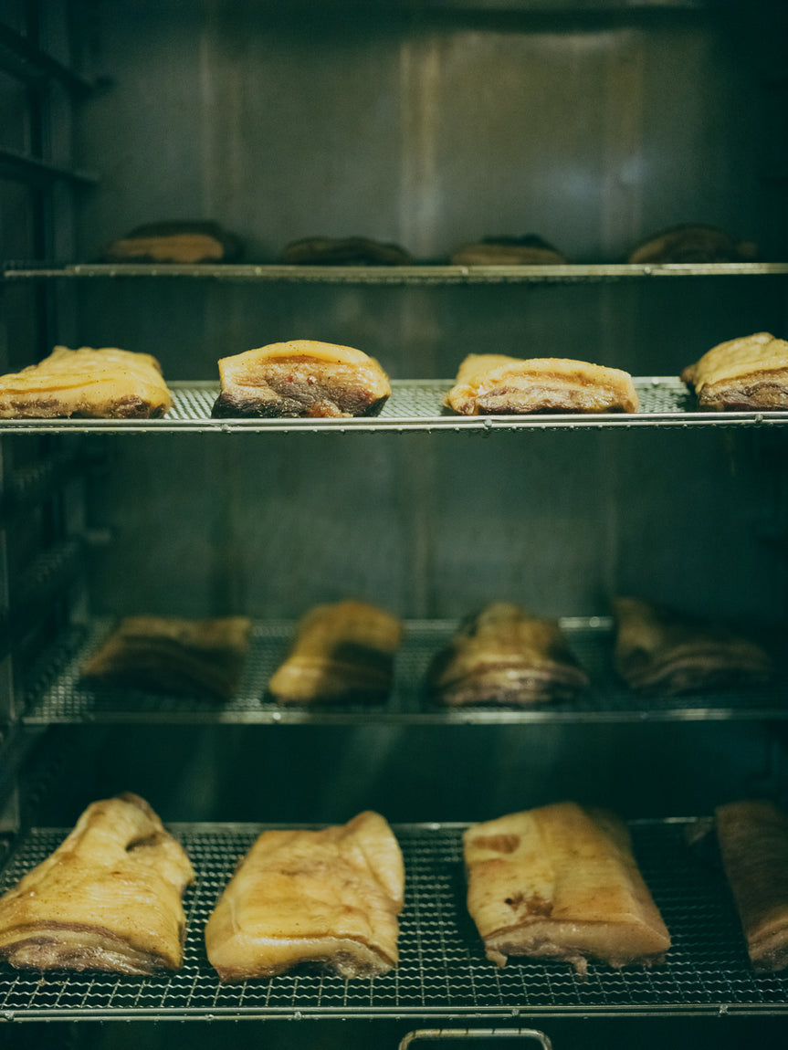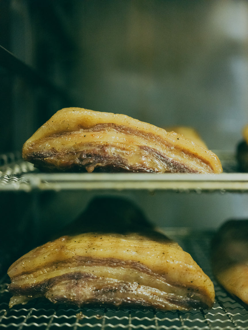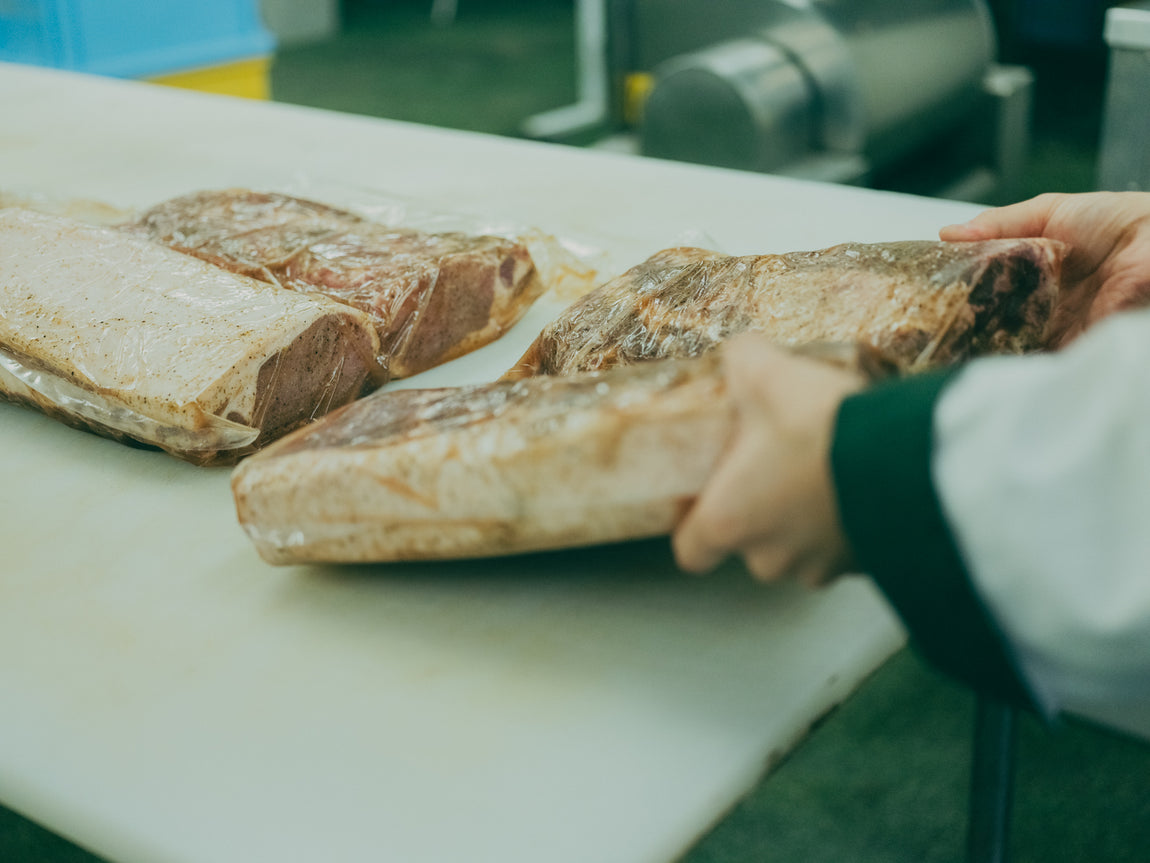 うまみ調味料などの添加物を一切使わず、「走る豚」から丁寧に仕上げた無添加ベーコン。原材料はすべて自然由来で、熊本県天草の天日塩や、熊本県芦北町の自然由来の黒砂糖など、地元九州の素材を中心に調合したオーガニックスパイスが素材の味を引き出します。独自で生み出した無添加の漬けダレに約3週間かけてじっくり漬け込み、毎日手作業でひっくり返して熟成。国産の桜チップで燻すことで、やさしく香ばしい燻製香でしっとりとした食感に仕上がります。脂っぽさはなく、肉の旨味が凝縮された塩加減のいいベーコンです。
