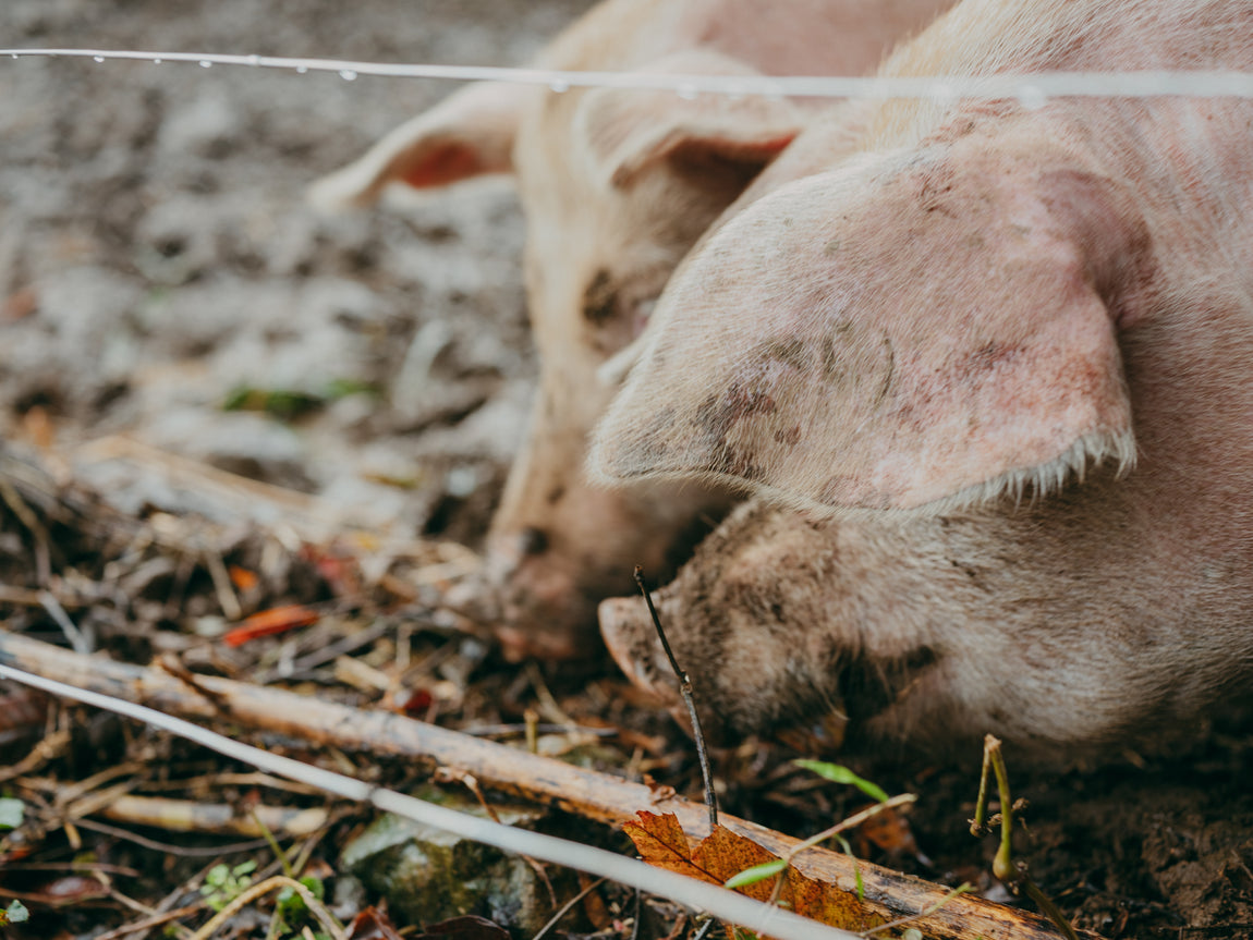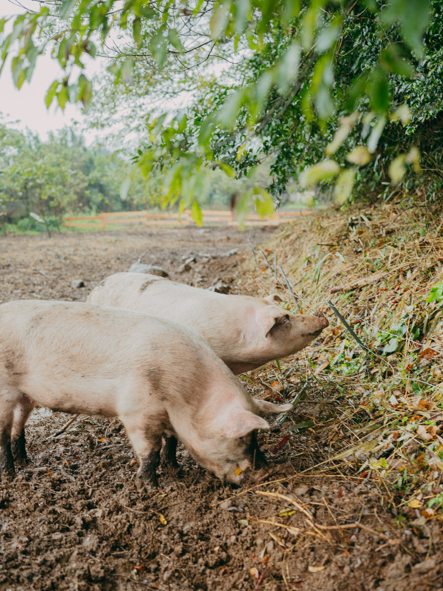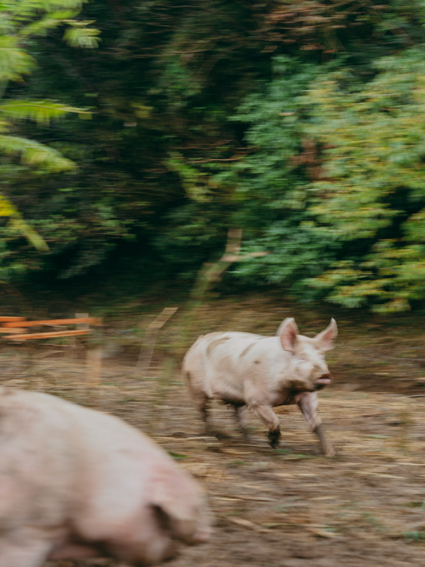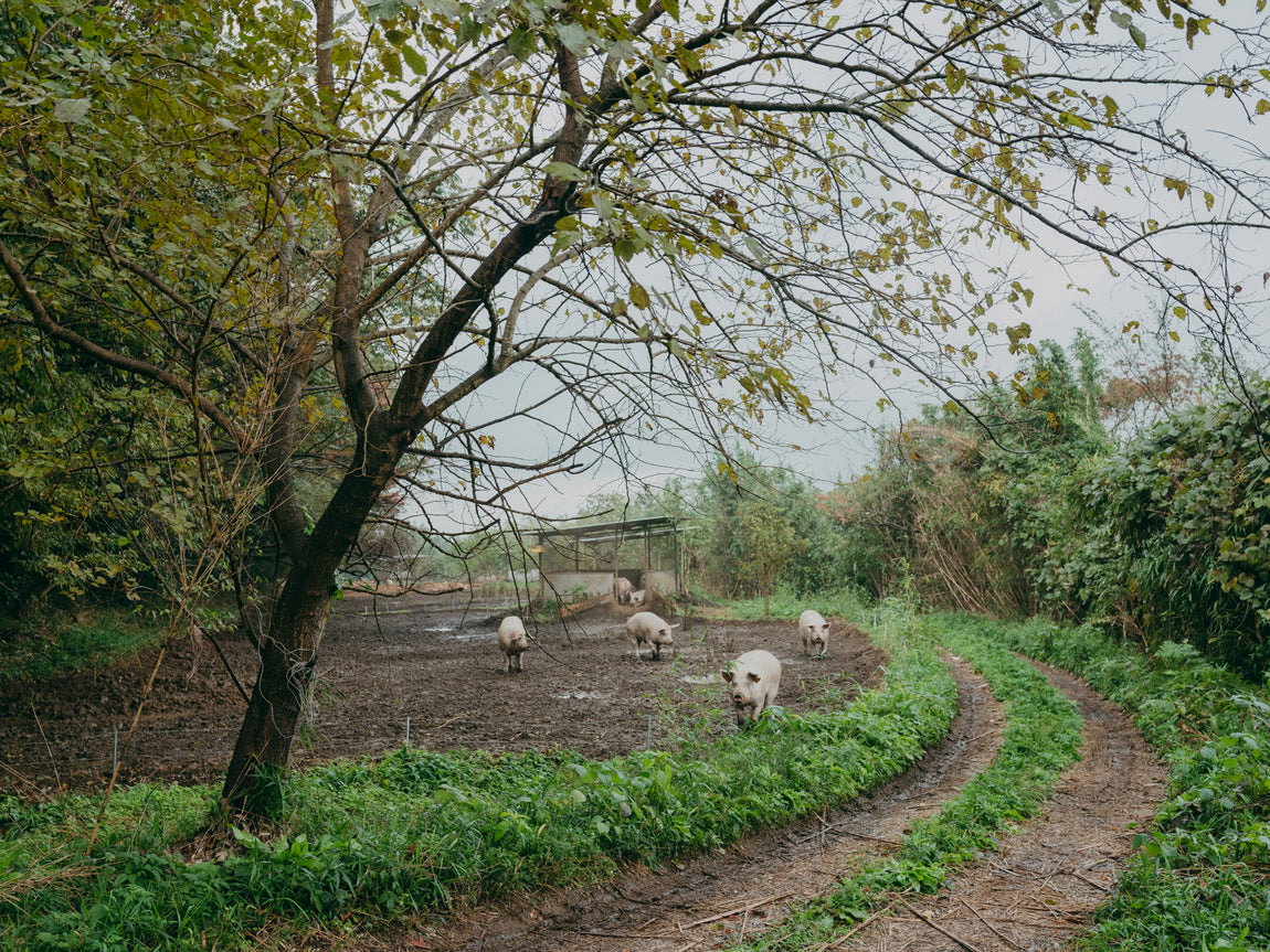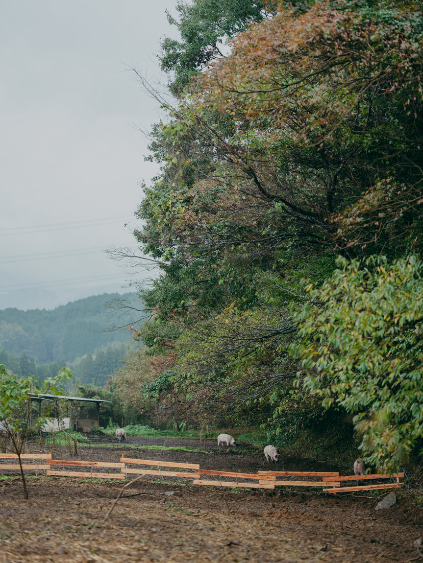 「走る豚」は、野に咲く野草やドングリ、栗、木の根などの山の恵みを存分に食べ、すくすくと育ちます。さらに、自家栽培・自然栽培の野菜や遺伝子組み換えでない穀物など豚たちの腸内環境を整える食事も用意。1年の放牧後に2年土壌を休ませることで、豚の糞尿が分解された微生物豊かな土壌で森の生態系や畑の再生を待ちます。十分に休ませた畑で育てたさつまいもなどの野菜、再生した森の豊かな木の実などをまた豚が食べるという大きな循環のなかで育つ「走る豚」。ホルモン剤、抗生物質を一切使わず、通常より長期間飲む母豚の母乳やミネラル豊富な阿蘇外輪山系の井戸水など自然の力で免疫力を高めています。