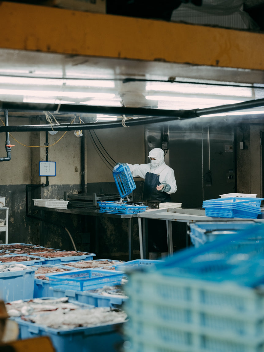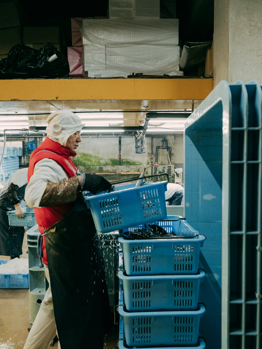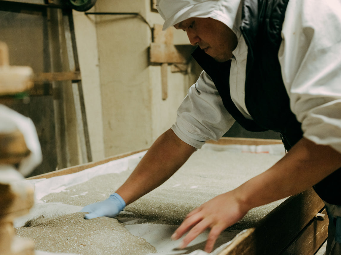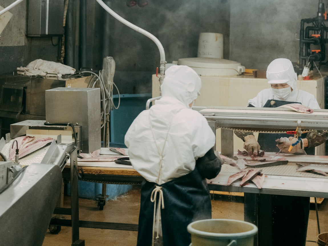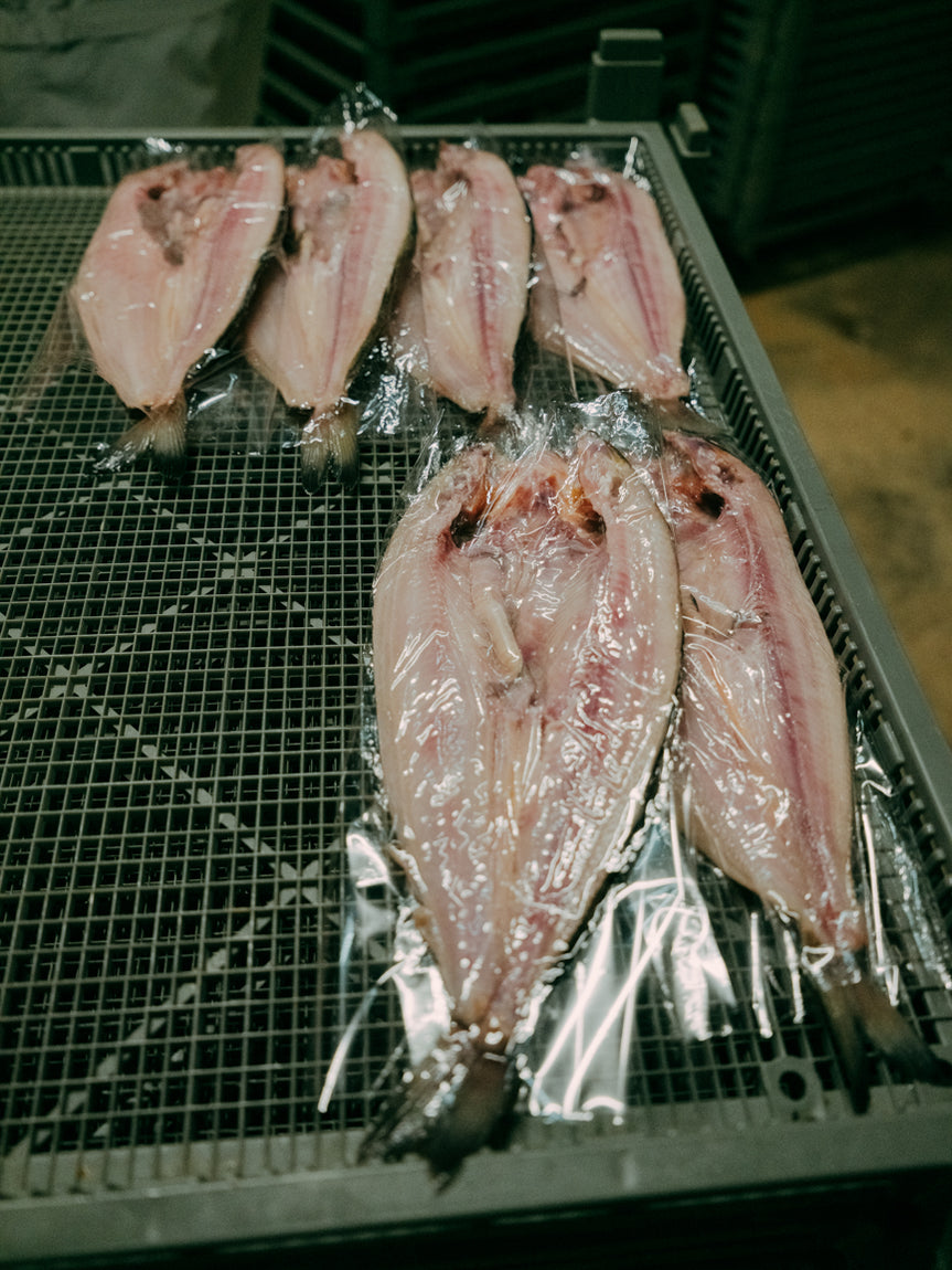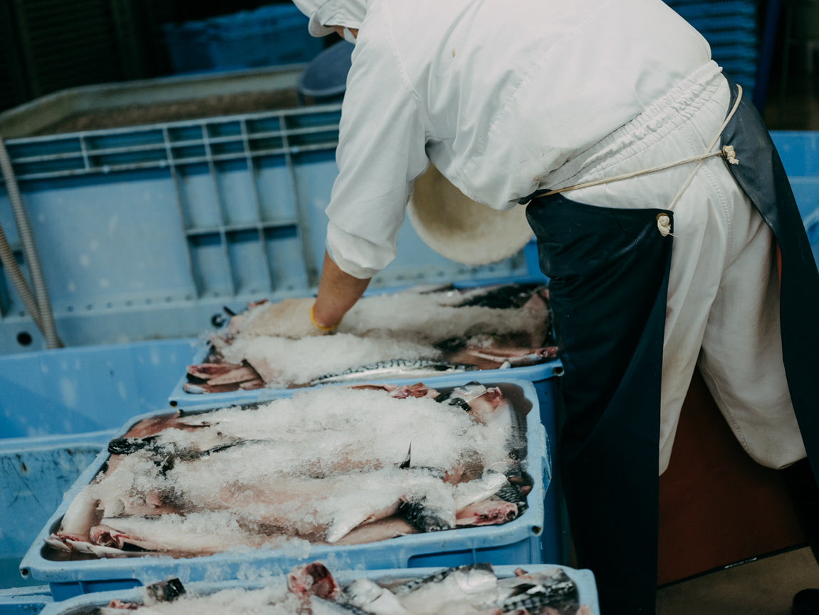 氷で締めた2.5℃の海水で均等に解凍することで、魚本来の引き締まった食感と旨味が溶け出さないよう工夫されています。熟成期間は、素材の厚みや脂乗り、気温や湿度によって職人がひとつひとつ手作業で調整しています。特にこだわっているのが、唯一の味付けである塩加減。どこよりも魚に馴染んだ赤穂の塩で作った6%の低濃度塩水に長時間漬けることで自然な塩気と旨味を均等に閉じ込め、どの部分を食べてもほどよい塩味が広がります。
