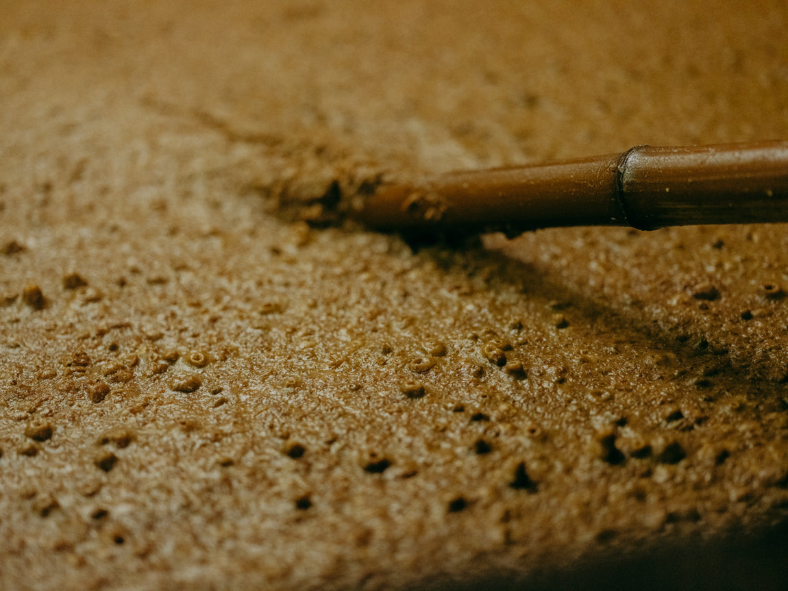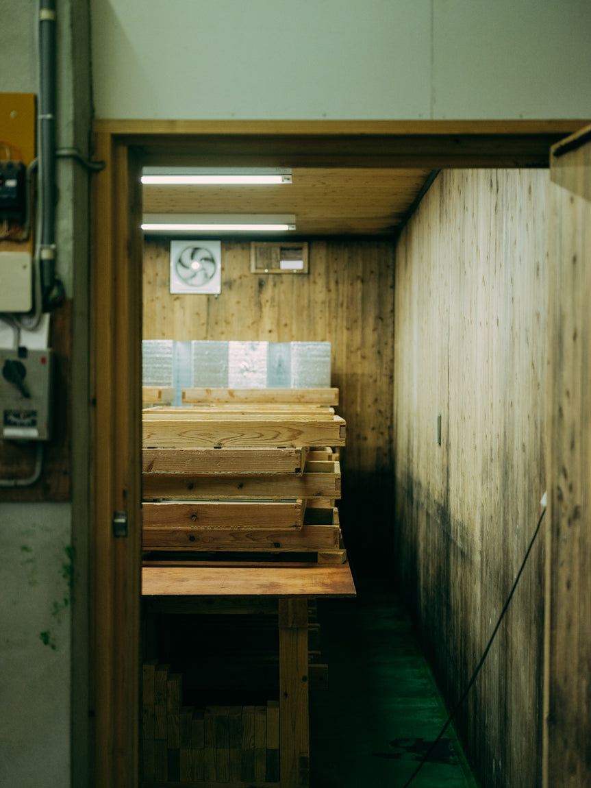 高温多湿の室(むろ)という専用部屋で数日かけて行われる麹造り。部屋の中央と隅ではどうしても温湿度に若干の差が出てしまうため、ミツル醤油では「麹箱」という木製容器に米を小分けに入れ、それを数時間おきに積み替えるという昔ながらの製法を行っています。また麹箱の底面はしなるほど薄い割り板が使われるのが一般的ですが、通気性の良いメッシュ素材に替えることで過度な発熱を防ぎ、より安定した環境で麹菌の発酵をサポート。こうして糸島産の米から丁寧に造った米麹、そして甘酒が、醤油の豊かな旨味や香りの源となっています。