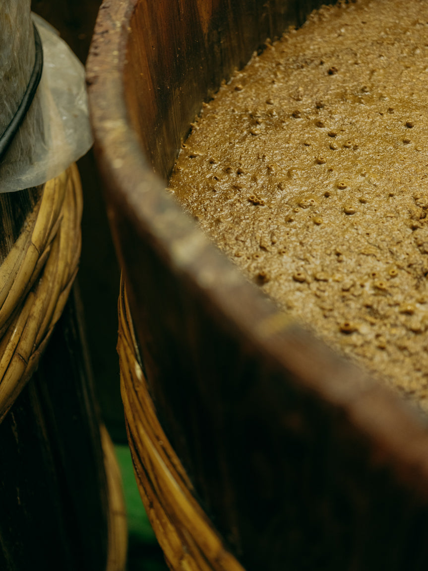 原料には地元である糸島産の大豆・小麦・米、そして沖縄県産のシママースという塩を使っています。ひと夏熟成させたフレッシュな諸味に、自家製米麹と糸島の水で造った甘酒を合わせ、調熱させて搾った純粋無垢なお醤油。天然醸造の淡口醤油ならではの引き締まった口当たりが特徴で、繊細な旨味の余韻が長く続き、ほのかに甘い麹の香りが広がります。