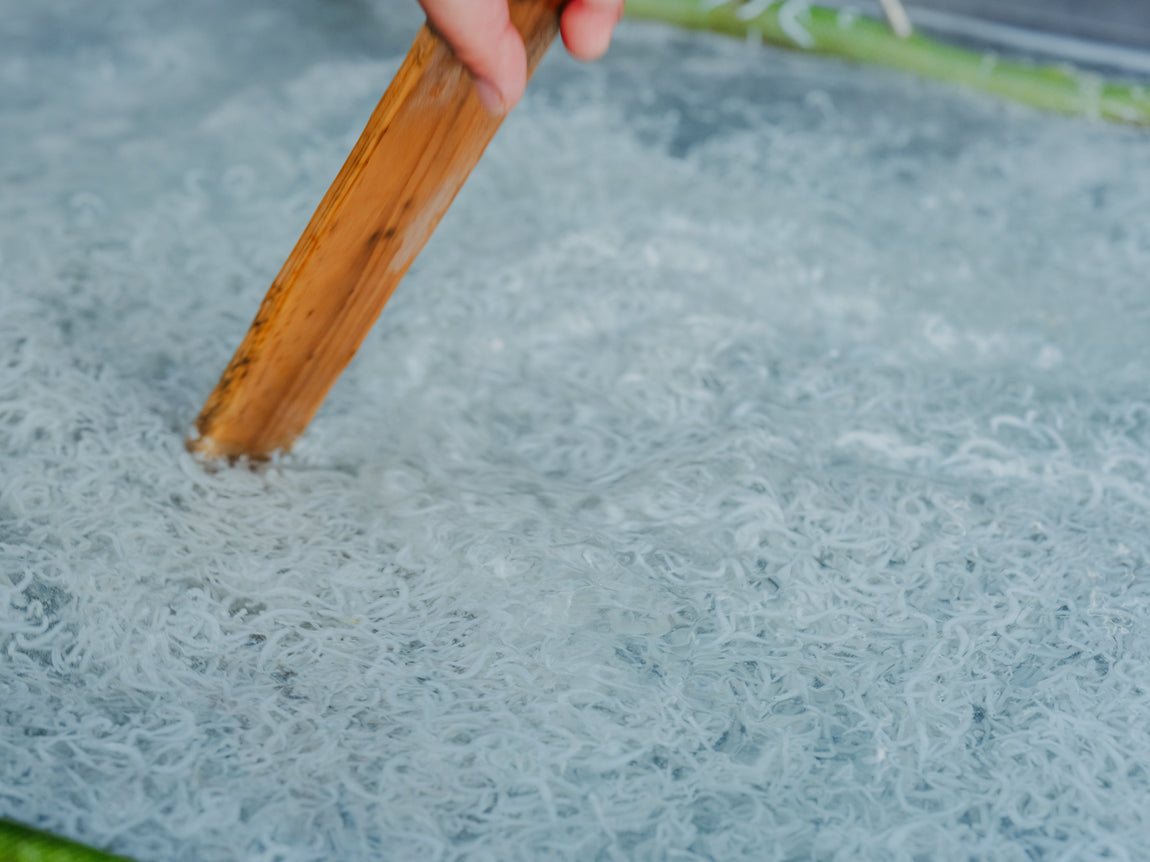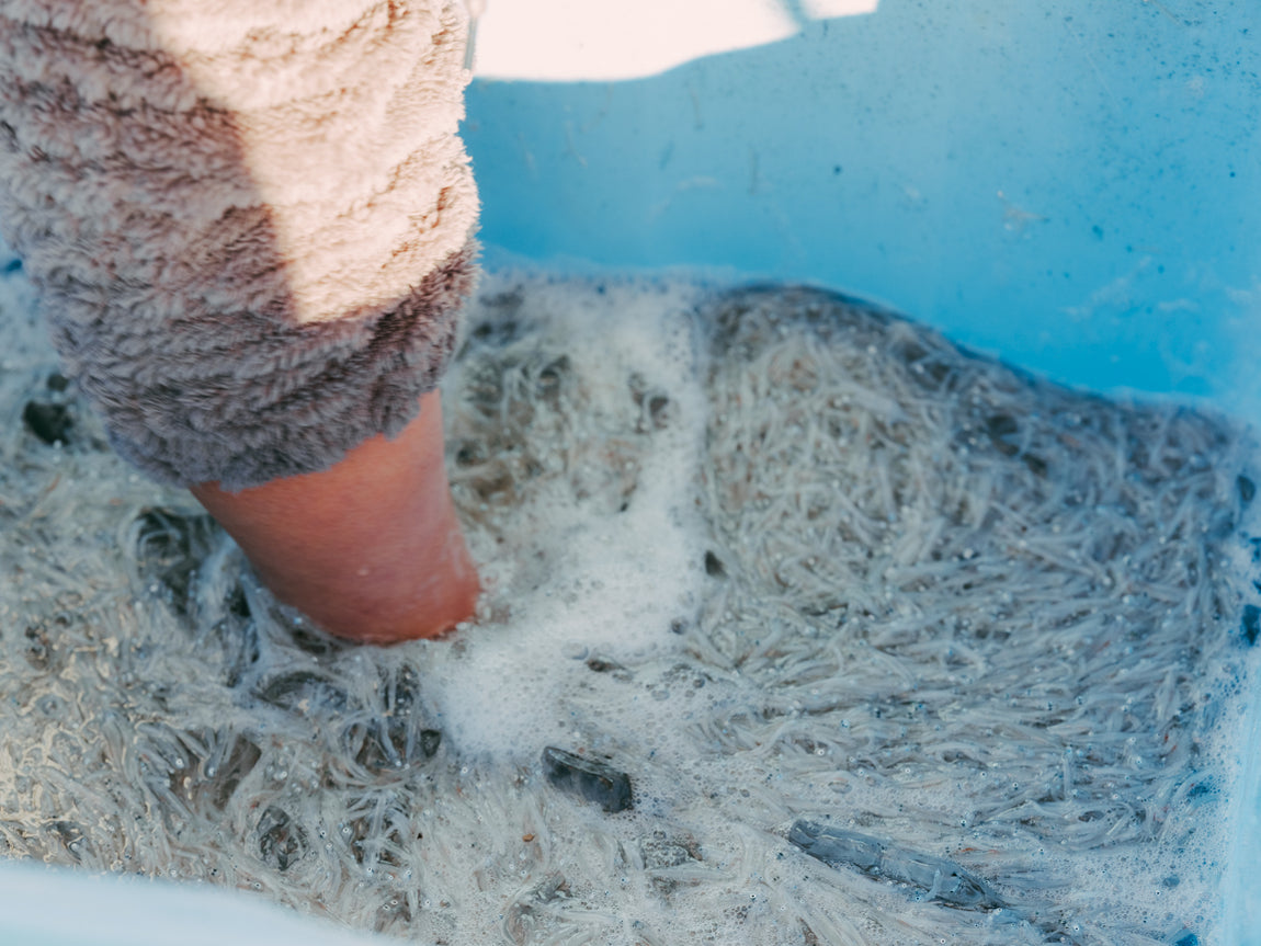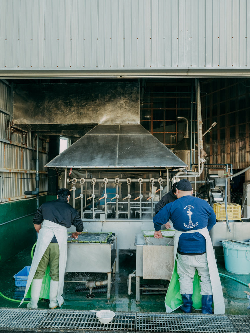 魚体の弱いしらすは鮮度が命。王子水産は三輪崎漁港で唯一のしらす漁の網元のため、競りを挟む必要がなく、水揚げを終えたら自社加工場へ直行して新鮮なしらすを釜揚げしています。工場の目と鼻の先の海での漁から加工までにかかる時間はわずか50分。ふんわりしっとりと柔らかすぎない食感で、試食会でも満場一致で「おいしい」という声が揃いました。