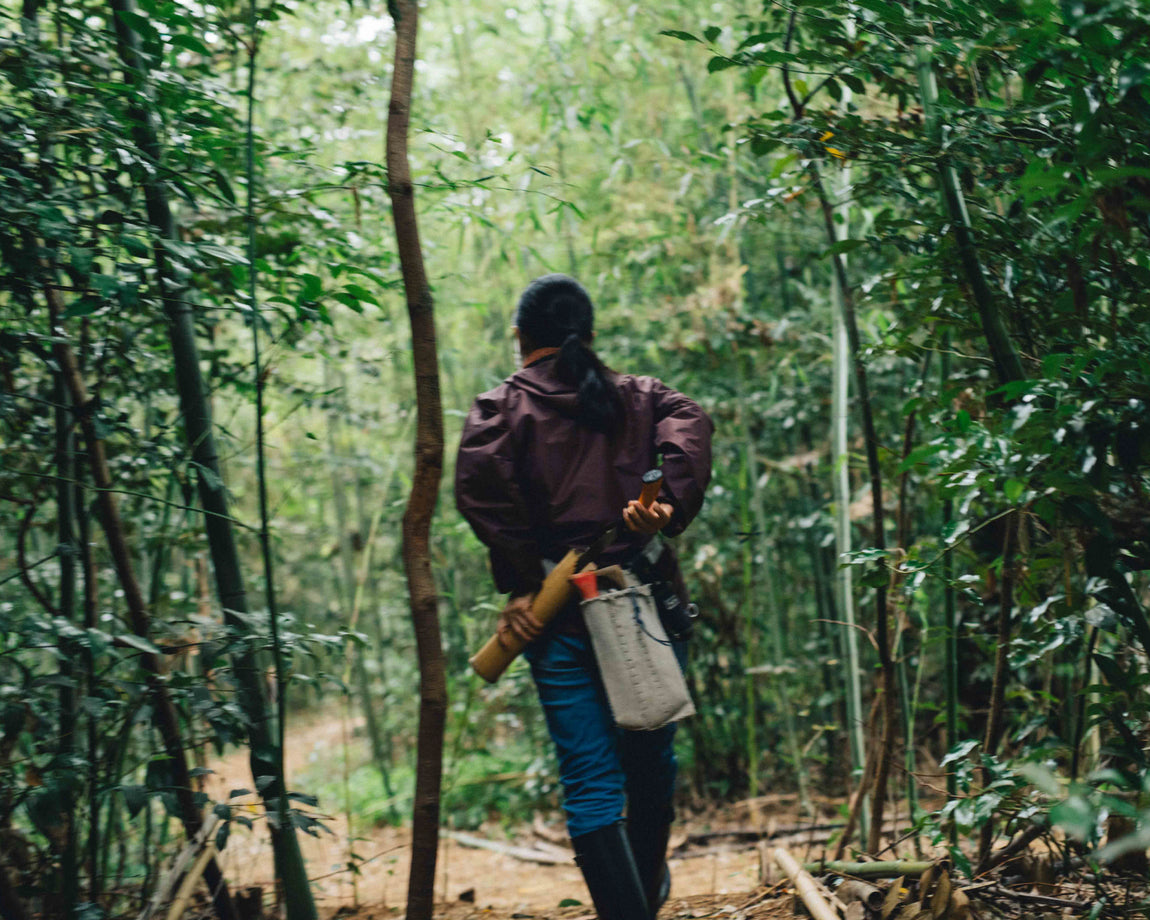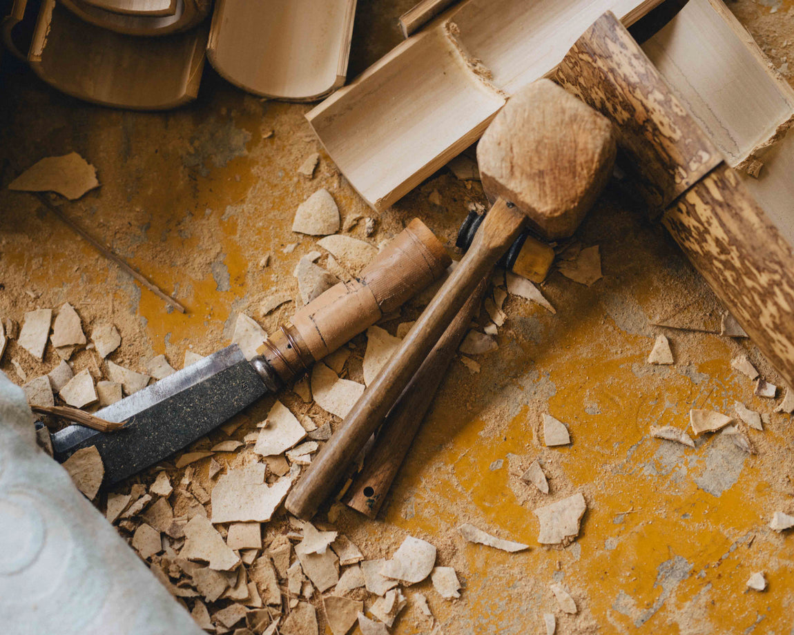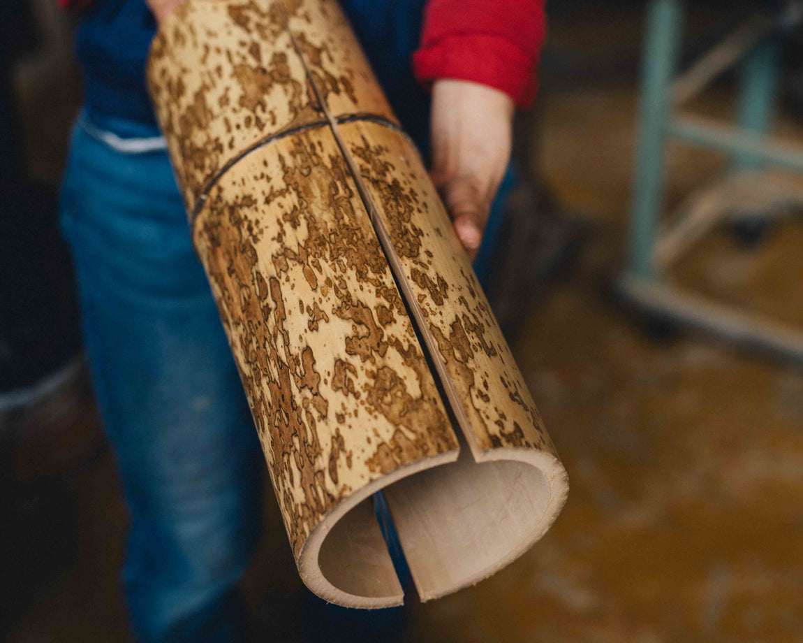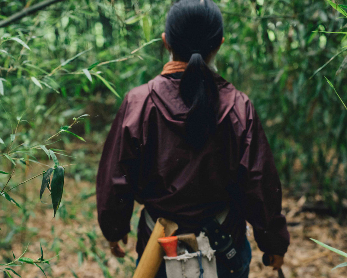 古代、箸用として朝廷にも納められたという京都・乙訓(おとくに)産の竹。そんな品質の高さと生育環境を守るために、高野竹工では自ら竹林を管理し、使われる目的によって相応しい竹を選び、伐り子と呼ばれる専任の職人が切り出すところから高野竹工のものづくりがはじまります。長年培ってきた技術を継承しながら、竹1本1本に火を入れ、油抜き、天日干し乾燥、荒ごなし、割り、削り、ため直し、塗りといった工程を職人が分業し、上質で美しい竹製品を作り続けています。