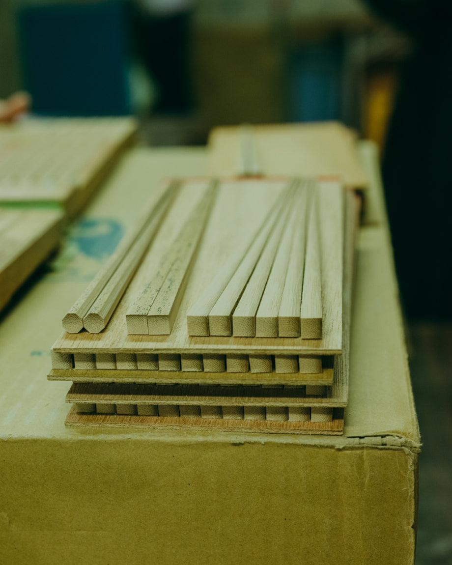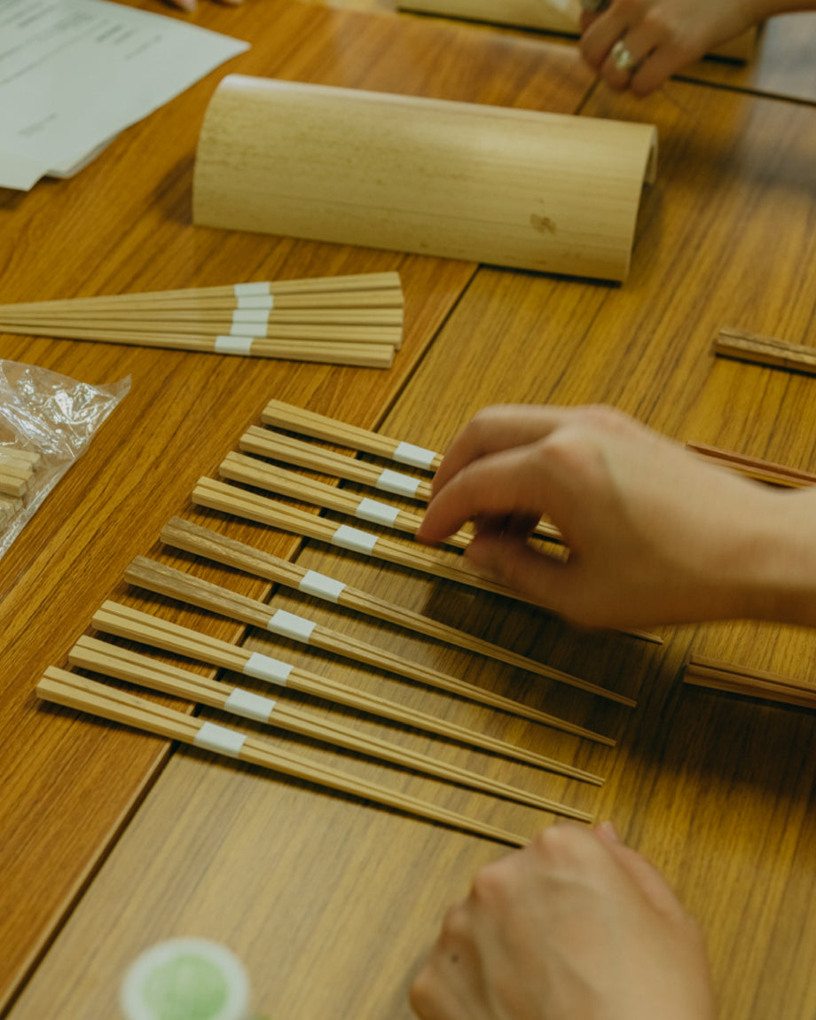箸は2本1組で数える道具。高野竹工ではその2本の組み合わせにもこだわり、竹を割った時点でもともと隣り合っていた2本を「対」と呼び、全ての作業を終えてお客様の元へ届くまで、ペアが離れ離れにならないよう管理を徹底しています。別々の素材から切り出した2本ではなく「対」の2本を1膳の箸に仕立てることで、手に持った時の力の伝わり方や表面の模様が揃い、使い心地が抜群に良く、より壊れにくく美しい1膳が完成します。