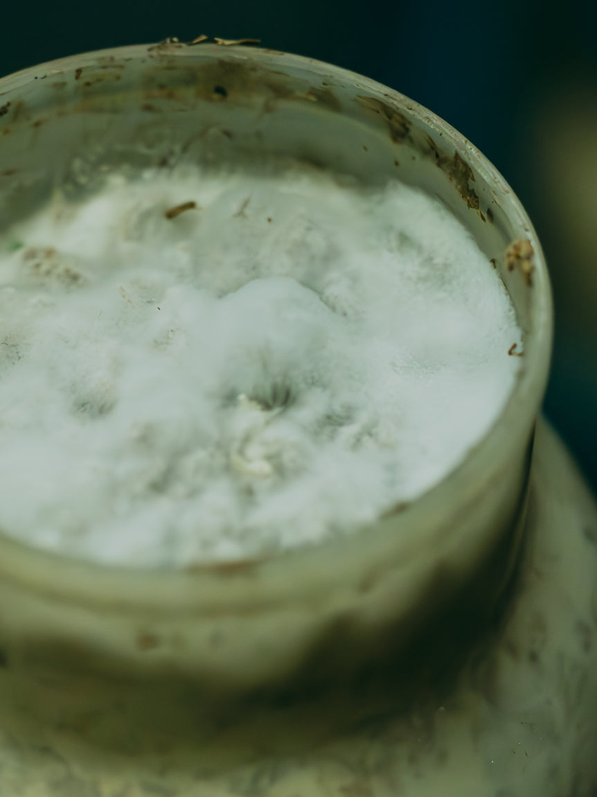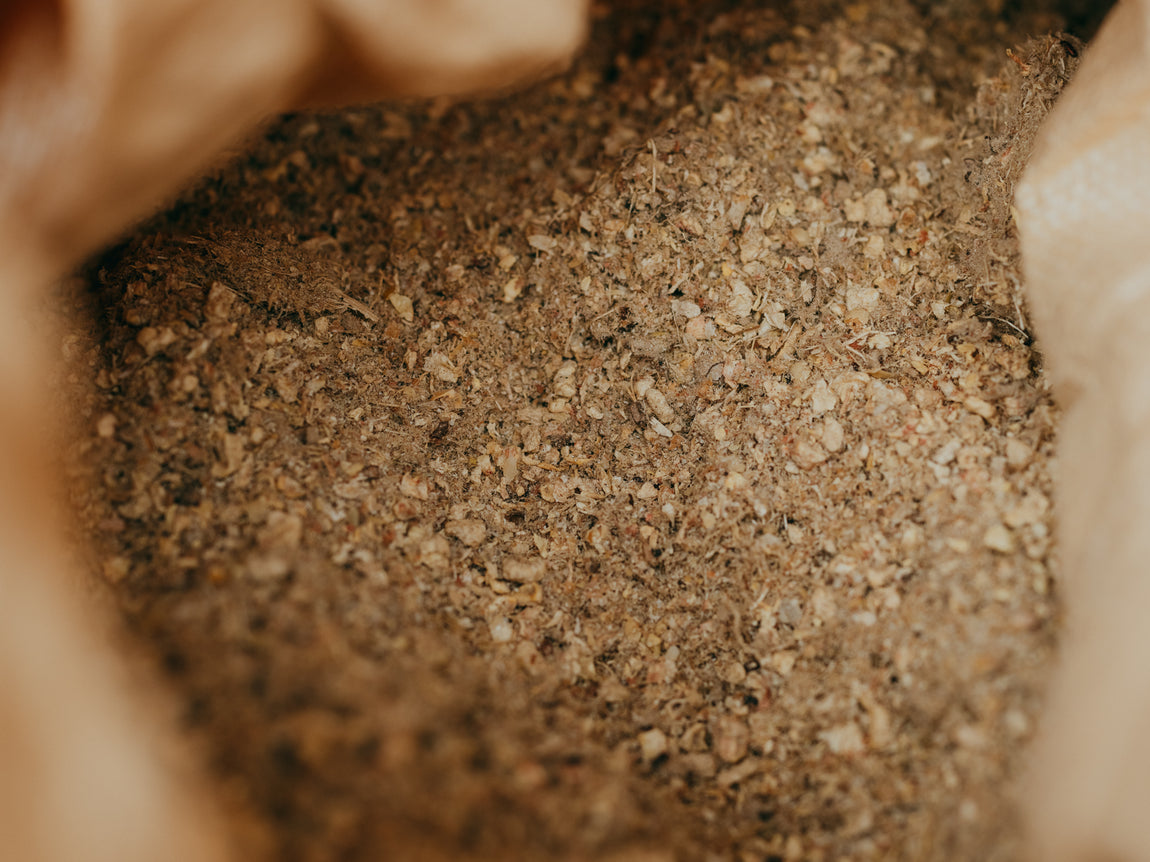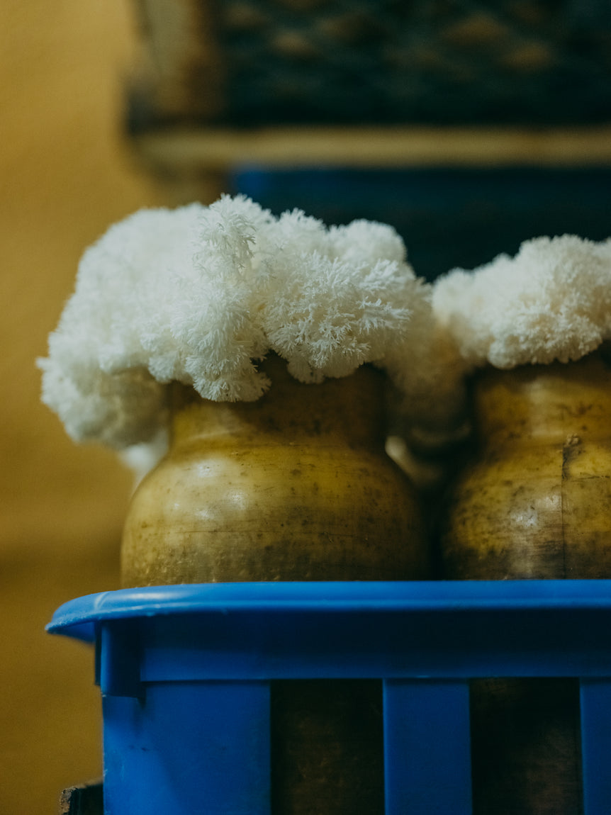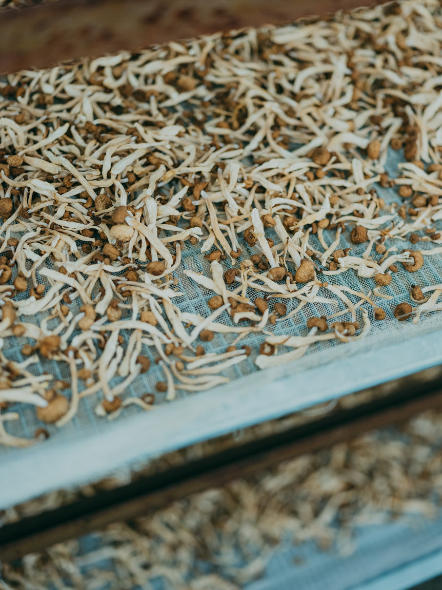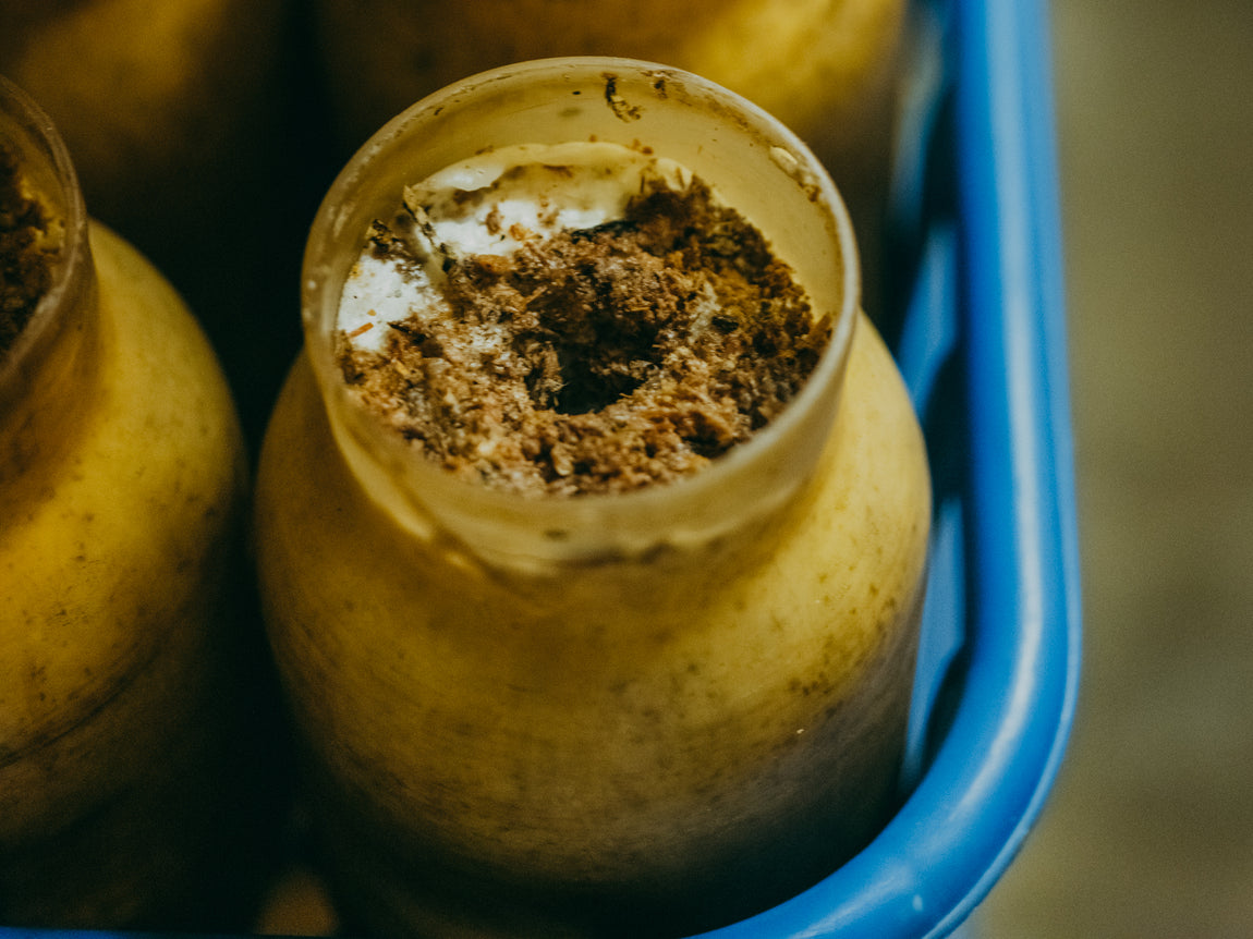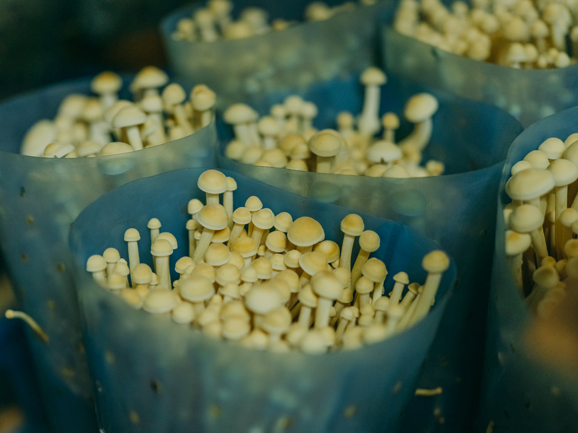 琥珀茸の美味しさは、きのこ王国が独自に開発した「多様性の高い菌床」から生まれます。基本となるコーンコブ(乾燥させたトウモロコシの芯を細かく砕いたもの)やおがくずに、海藻、大豆の搾りかす、カキの殻など、海と大地の豊かな有機物を独自にブレンド。仲間4人で切磋琢磨しながら研究を重ね、より美味しいエノキが育つための理想的な配合を追求し続けています。この10種類近くの素材の組み合わせでできるオリジナル菌床は、他社には卸されないきのこ王国だけの企業秘密です。多様な滋養をゆっくりと吸収して育つことで、琥珀茸に深い旨味と、野生種ならではの力強い風味が生まれるのです。