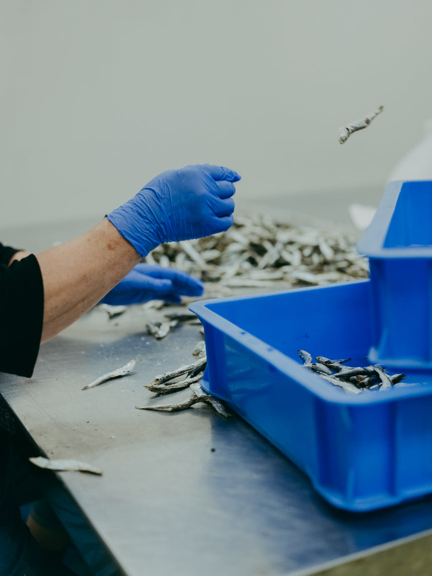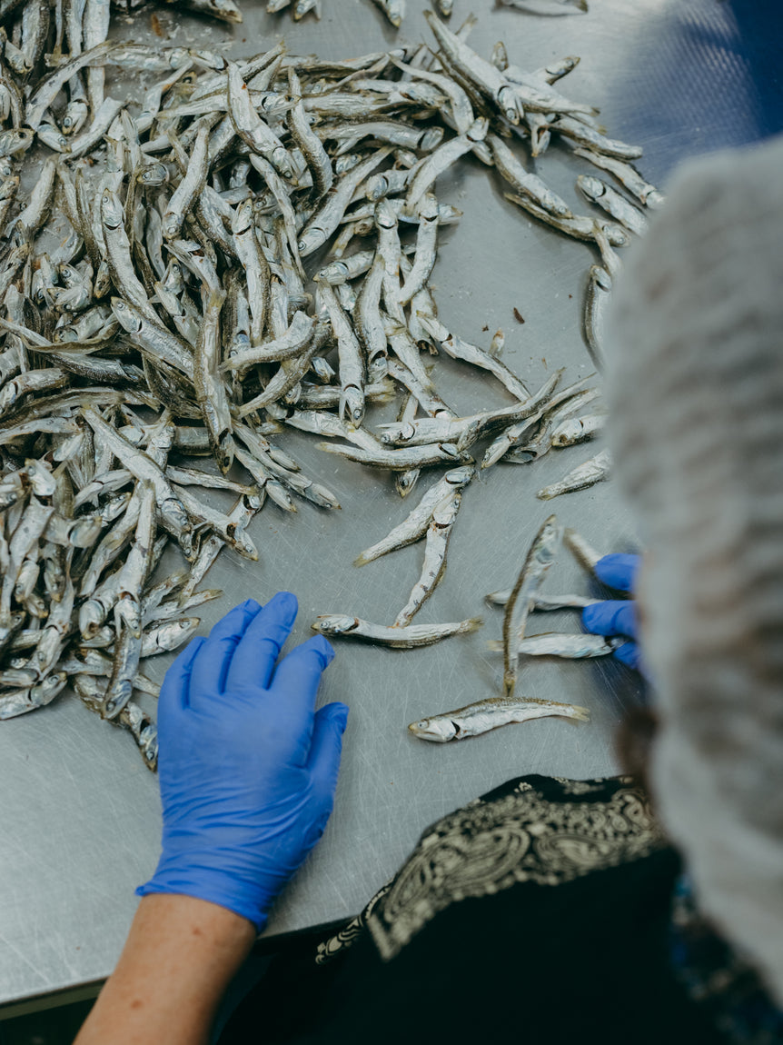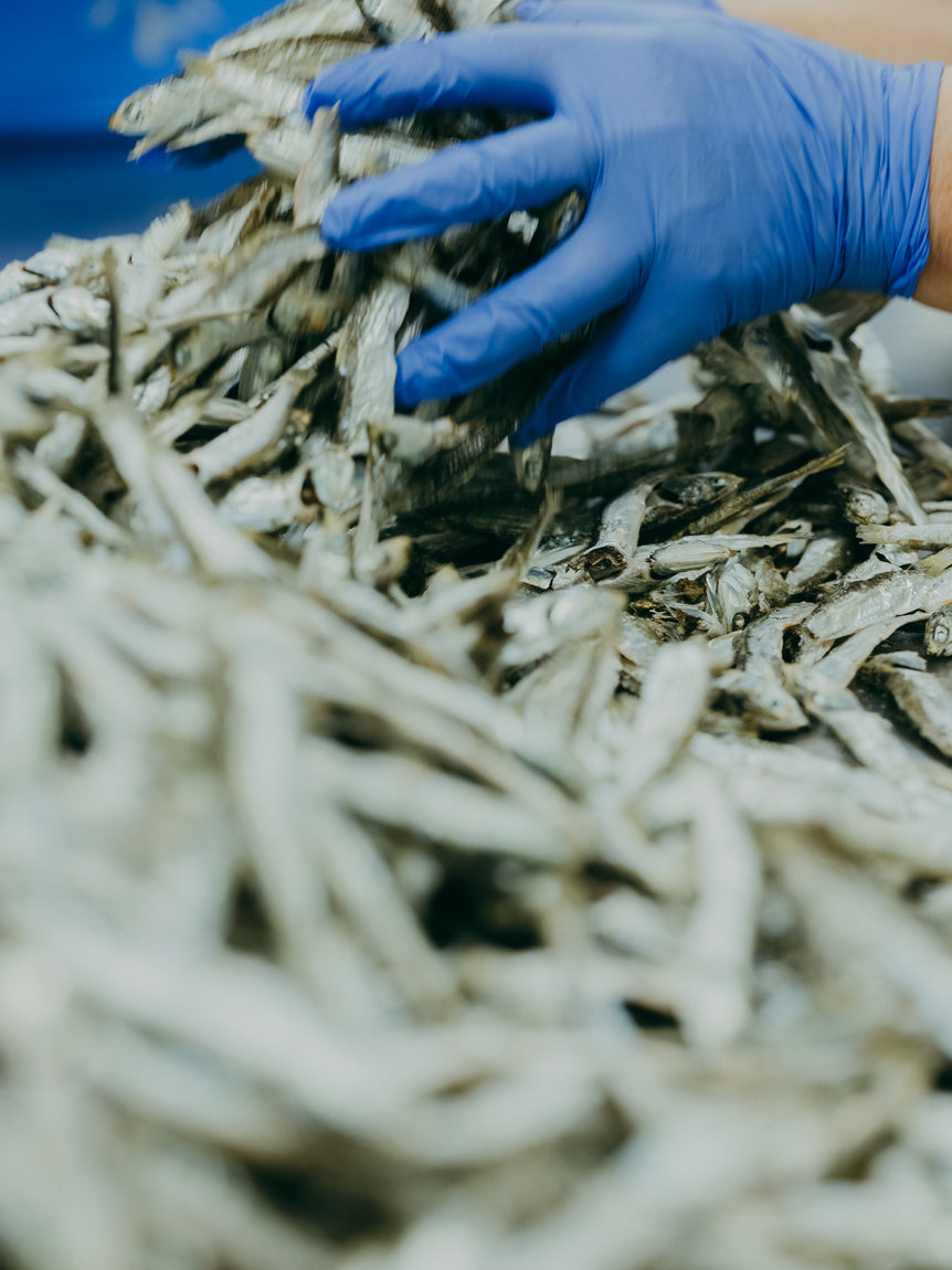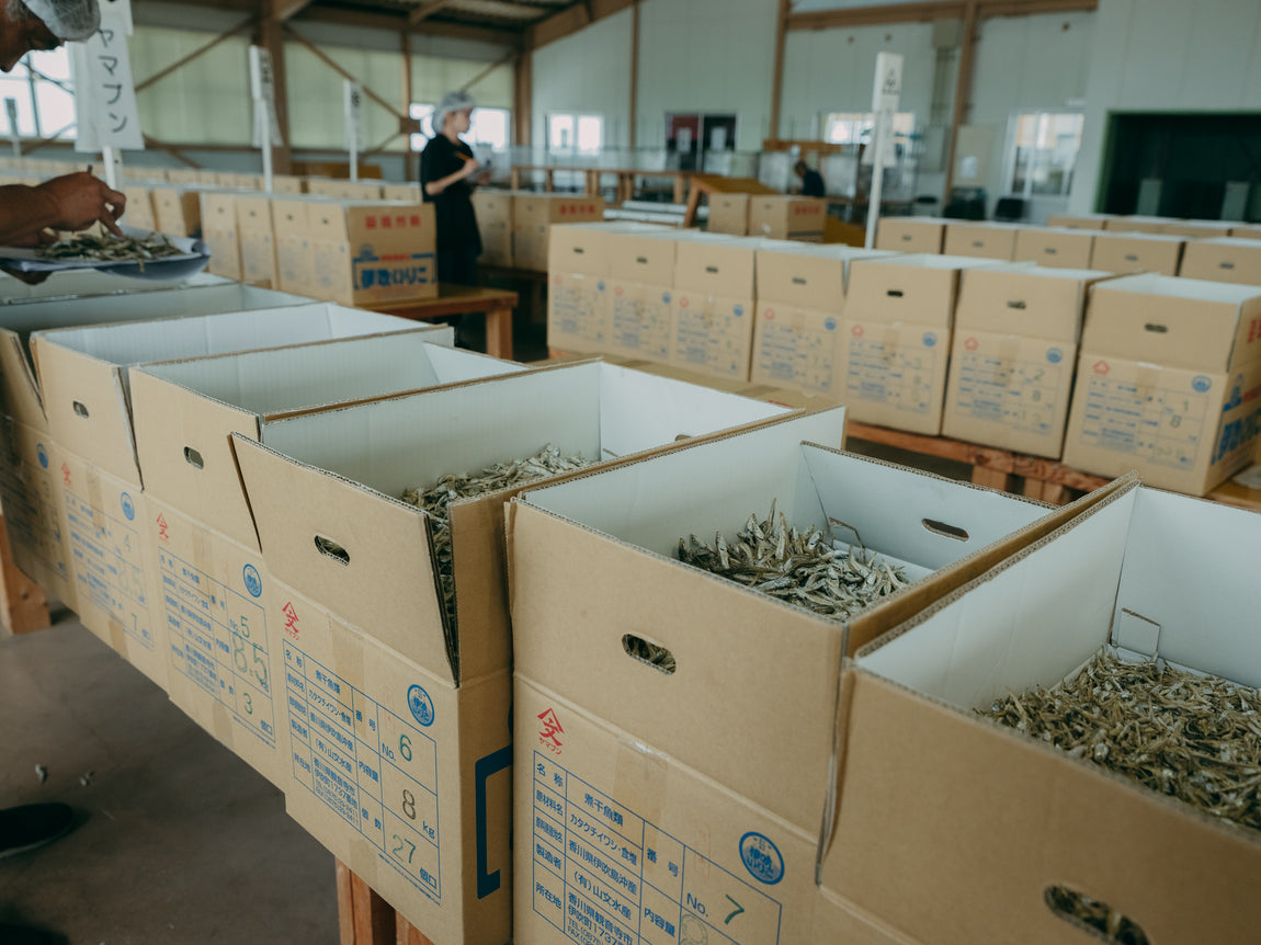 市場に集まった伊吹島すべての網元のものから状態のいい「いりこ」を厳選。「見た目・香り・味・感触」を確認し、朝獲れの一番いい「いりこ」を選別します。藤田水産の前身である渡海屋は元は網元だったため、「いりこ」の目利きは確か。直前まで元気だったカタクチイワシは釜茹でされると口を開けるのですが、あんぐり口の「いりこ」が多いのは鮮度の良さの証拠。その後、自社に持ち帰り、職人たちが手作業で念入りに選別し、袋詰めされる前にもう一度選別します。そして冷凍で3カ月寝かせることで水分を飛ばして全体を均一にし、品質を安定させます。