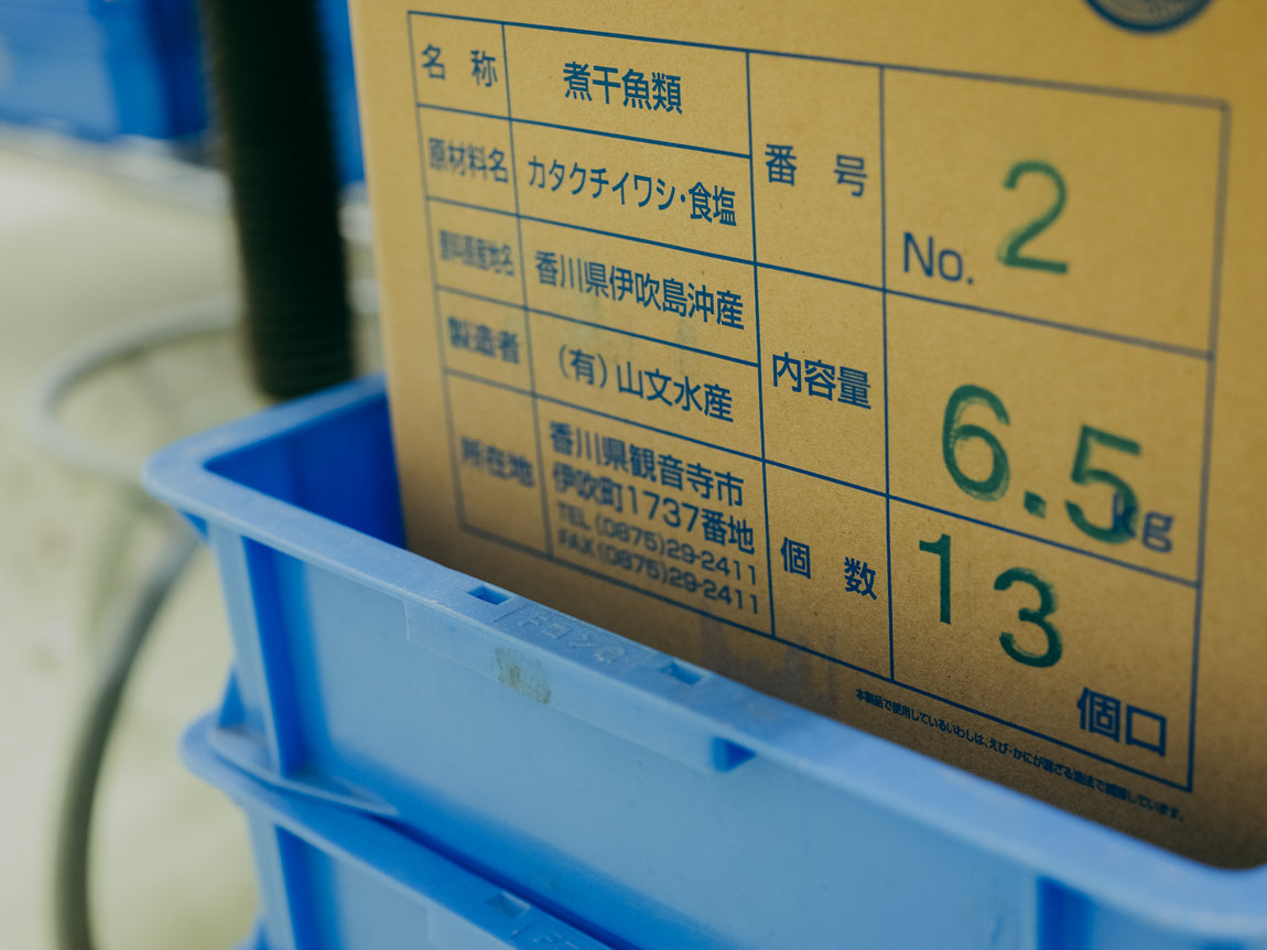 「食べる大羽いりこ」の素材は、香川県観音寺港沖約10kmにある伊吹島を中心とした瀬戸内海でとれたカタクチイワシ。瀬戸内海は内海で穏やかなため、ここでとれたカタクチイワシを「いりこ」にすると、骨や身が柔らかく水が浸透しやすいことから、濃厚で上品な出汁となります。漁獲されたカタクチイワシはすぐに漁場から近い網元の加工場に届けられ、釜茹でされて乾燥機に入れられて「いりこ」になります。このスピーディな工程が、鮮度を維持できる最大の理由です。