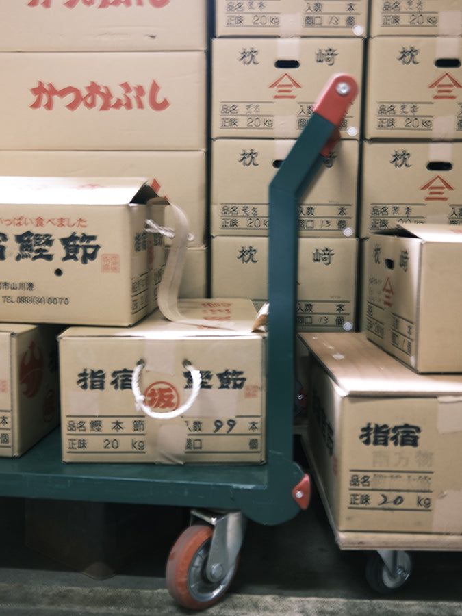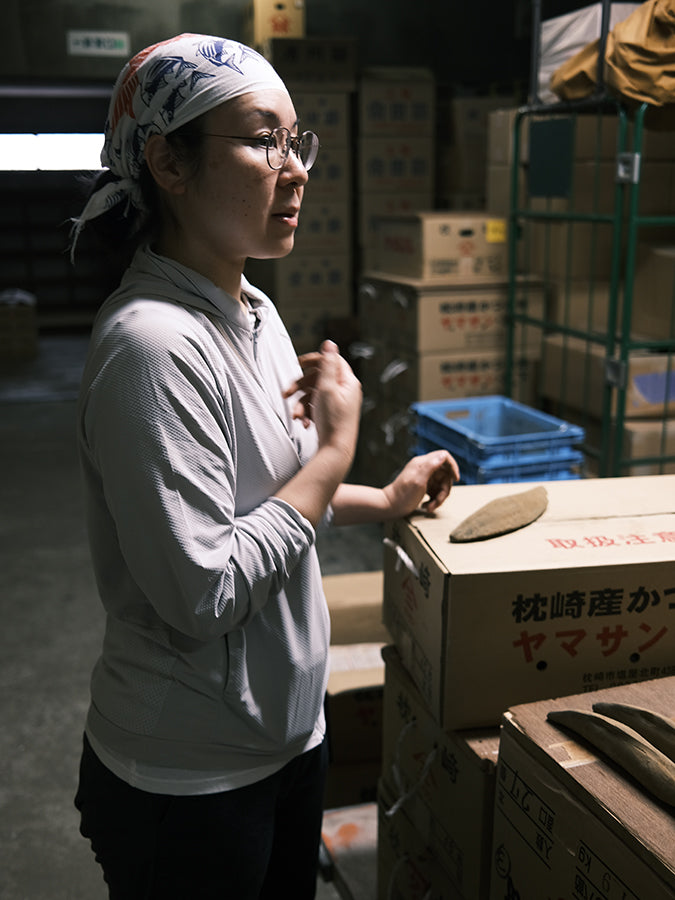 ずば抜けた鑑識眼で、鰹節の特徴を一本一本見定めているのが、老舗鰹節問屋「タイコウ」で鰹節の目利きとして鰹節コーディネーターを担う大塚麻衣子さん。鰹節を見ただけで、元の鰹がどんな状態で釣られたか、どのように作られたか製造方法までわかると言います。鰹節職人から届いた鰹節を自社で天日干ししながら乾燥・熟成させるなど最後の仕上げを行うのも彼らの仕事。大塚さんは元料理人としての経歴を生かし、関東と関西の食文化の違いを考慮し、料理人と対話して求められる味に近づけて鰹節を選別、もしくは複数の鰹節の特徴を生かして削り節をブレンドしています。花かつお「だしはこれ」も同様に、出汁を取るのに最適なバランスに組み合わせて削り、袋詰めしています。