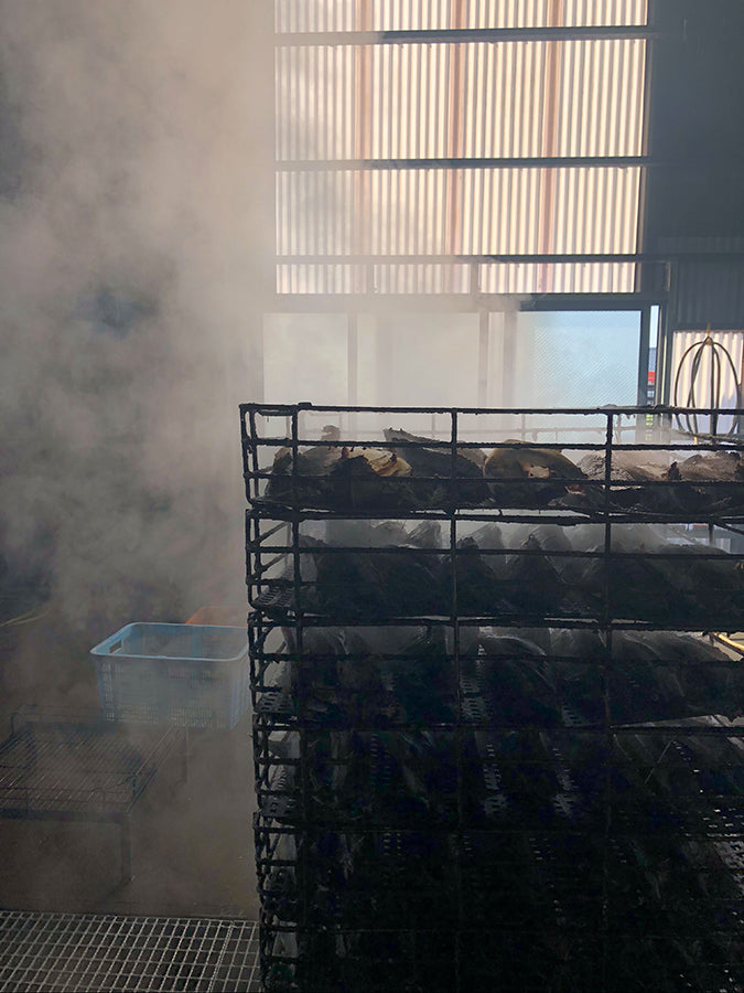 鰹節は「タイコウ」が長年、絶大な信頼をおく熟練の職人、鹿児島県枕崎市の宮下一家によるものが中心。そのほか、質の高い鰹節を作り続ける鰹節職人2~3社のものを使用しています。「だしはこれ」の原材料である荒節の作り方は、鰹の身を三枚におろして背と腹に分け、大釜で約100分煮てうま味を閉じ込めたら手作業で骨を抜き、骨が抜けたあとにはすり身を塗りこんで形を整えます。その後、薪で燻して水分を抜きつつ、香りをつける焙乾(ばいかん)を約2カ月繰り返し、1カ月ほど乾燥させるという、手間も技術も必要な作業です。昔ながらの伝統的な製法を守り続ける一流の職人によって、最高品質の鰹節ができあがります。