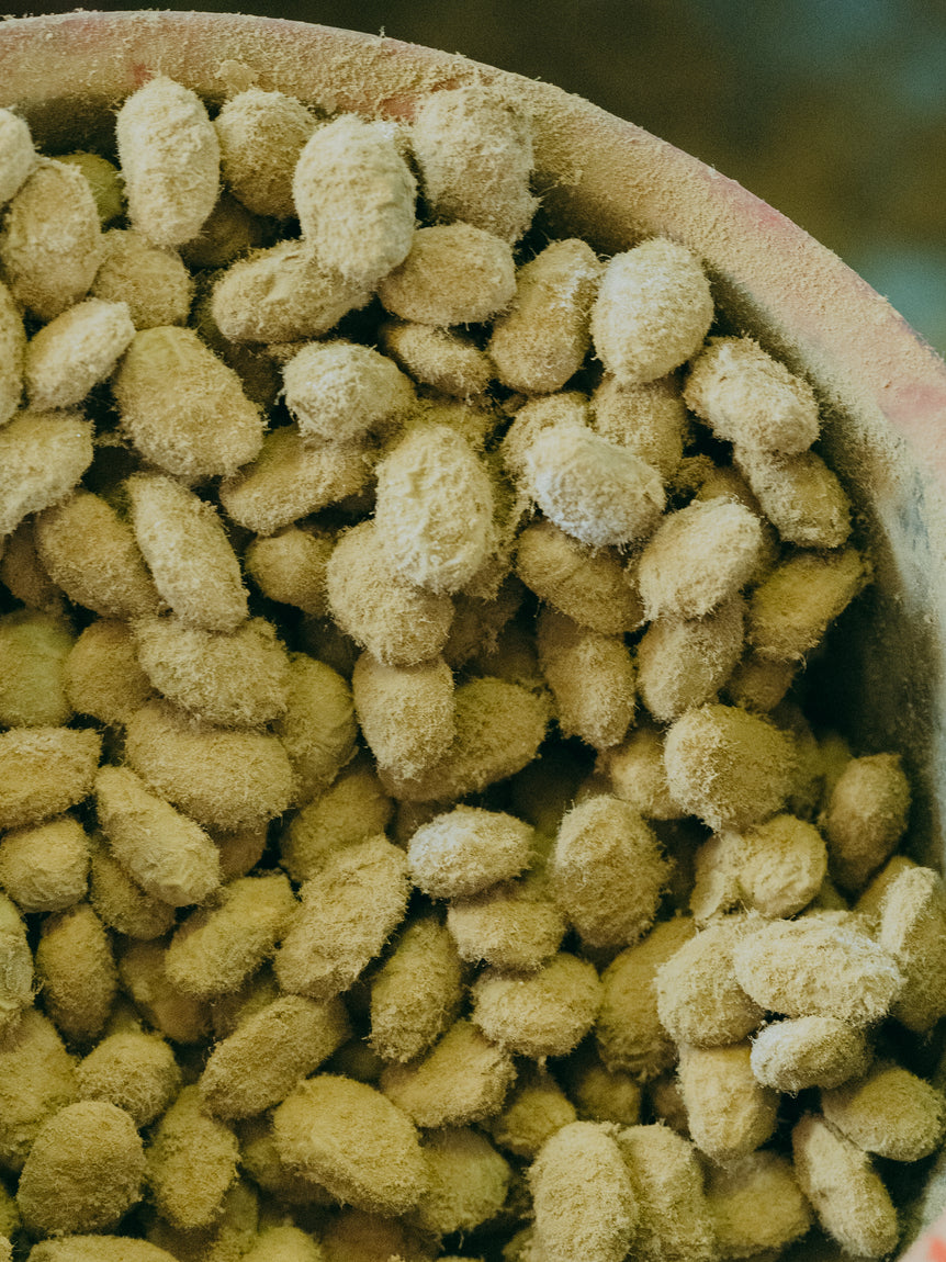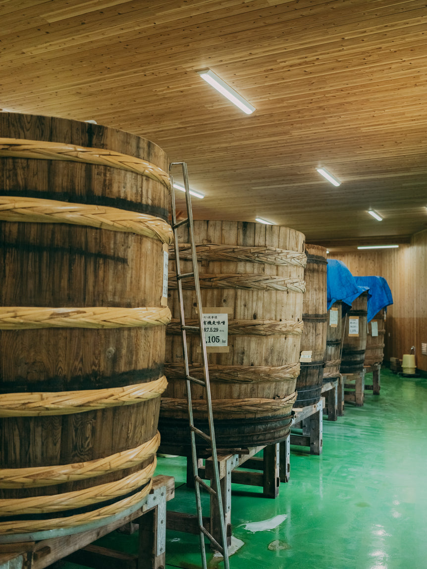 味噌づくりには自然採取した野生麹菌を使用。3代目が自家用味噌のために自家採取していた方法がベースになっています。水に浸した蒸し青大豆を蔵において麹菌を採取しますが、自然栽培の青大豆を使用し、蔵内の温度と湿度のバランスがとれていることが大切。この野生麹菌をもとに米麹を作ります。雪の積もる1~3月に木樽に米麹、大豆、米、塩、水を加えて仕込み、じっくりと10カ月間、時間をかけて低温で発酵・熟成させます。木桶は蔵の温度変化をゆるやかに伝えて発酵を安定させると同時に、木桶に住み着いた微生物が味噌に独特の風味を加え、より複雑で深みのある味わいが生まれます。