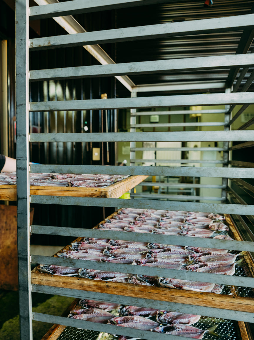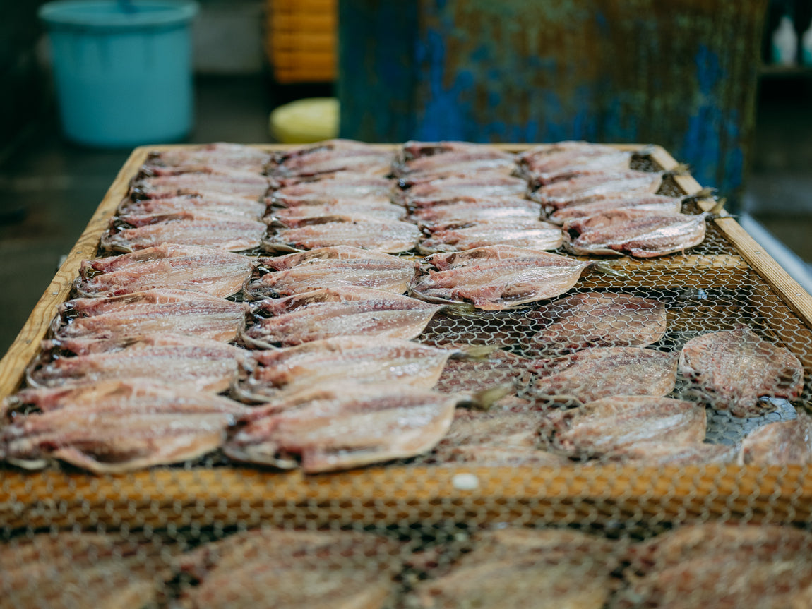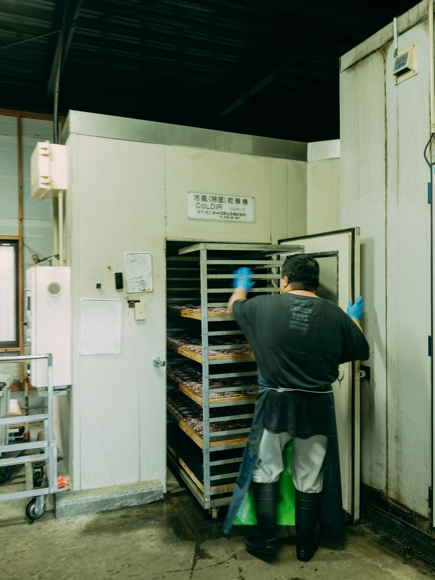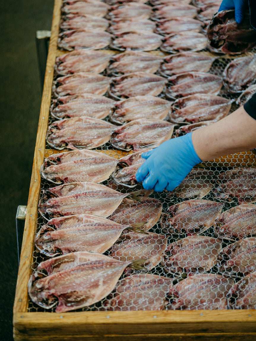 温暖になった今日でも、昔ながらの干物に適した11月の寒風である、程よくしっとり程よく乾いた柔らかい風に設定することで、上質な干物をつくり続けています。夏と冬では湿度や気温も異なるため、日々、そのわずかな違いに向き合いながら、衛生的な干物づくりのために採用している除湿乾燥機の風の湿度や乾燥時間を調整することで、なるべく一定の味を心がけています。