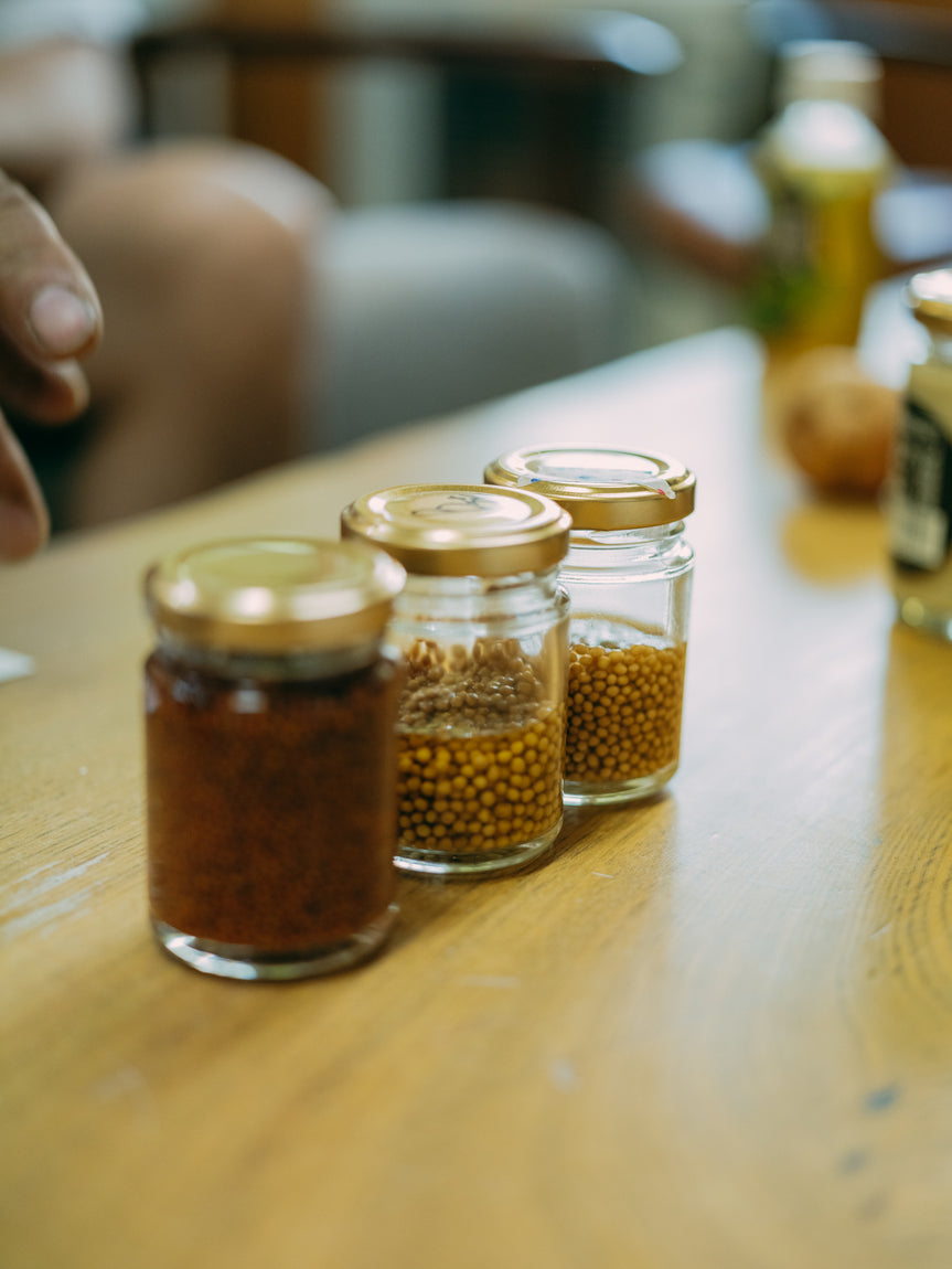 おいしい“種“を探すところからはじまり完成まで6年。農家だからこそ出せる味を目指し、世界各国から13のマスタードの種を取り寄せ、数年をかけて自らの畑で栽培テストを実施。農場スタッフ総出で何度も何度も試食を行い、そこから3品種のベストのバランスを発見しました。マスタードの豊かな風味とほのかな苦味、天然醸造のじゃがいも酢のまろやかな酸味と甘みは、和食、洋食のどちらにも相性がよく、ソーセージや小さな魚介類にものせやすい「粒ペースト状」なのもうれしいポイントです。