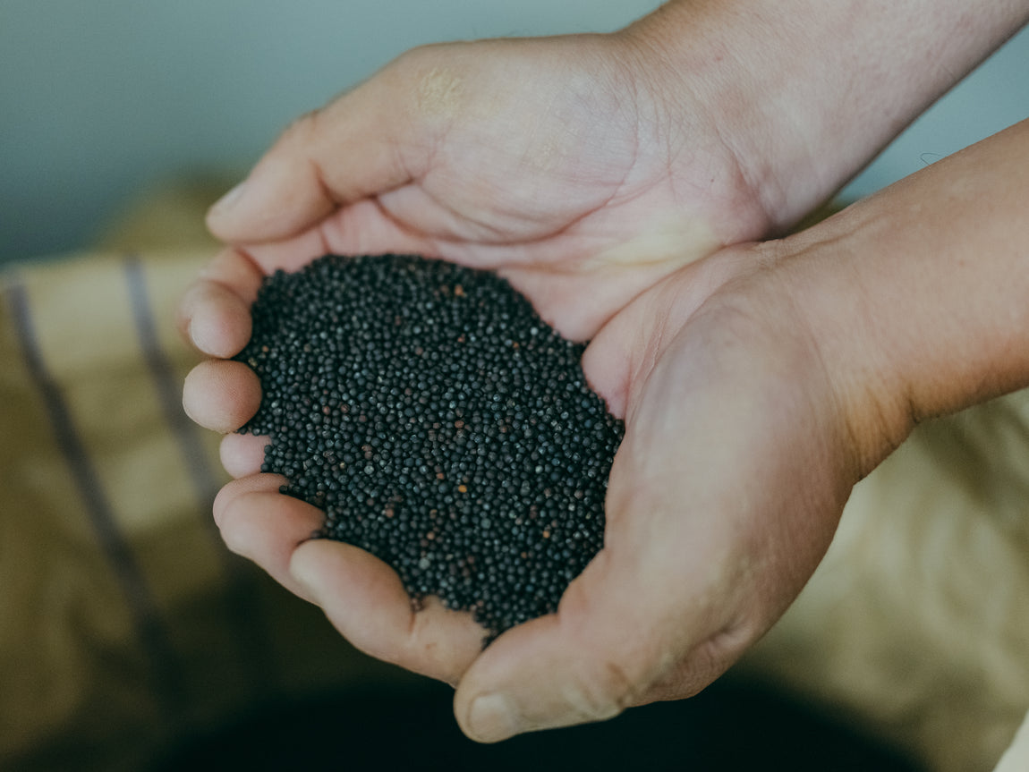 菜の花は農薬や肥料を使わず、太陽、水、大地の力だけで育てる自然栽培で育てています。種をまくのは9月初旬、収穫は7月で、品種は風味が豊かな「キザキノナタネ」。菜の花は寒さに強く、地中まで20~30cm根を張るため、冬はマイナス15℃になる極寒の環境でも越冬することができます。冬の寒さにさらされることで、菜の花は凍結を防ぐために細胞に糖分を蓄積して甘味が増し、エネルギーを蓄えた菜種に。栽培用の種は自家採種しており、いい種だけでなく出来の悪い種もバランスよく採種して植えることで、土地の風土に順応させています。