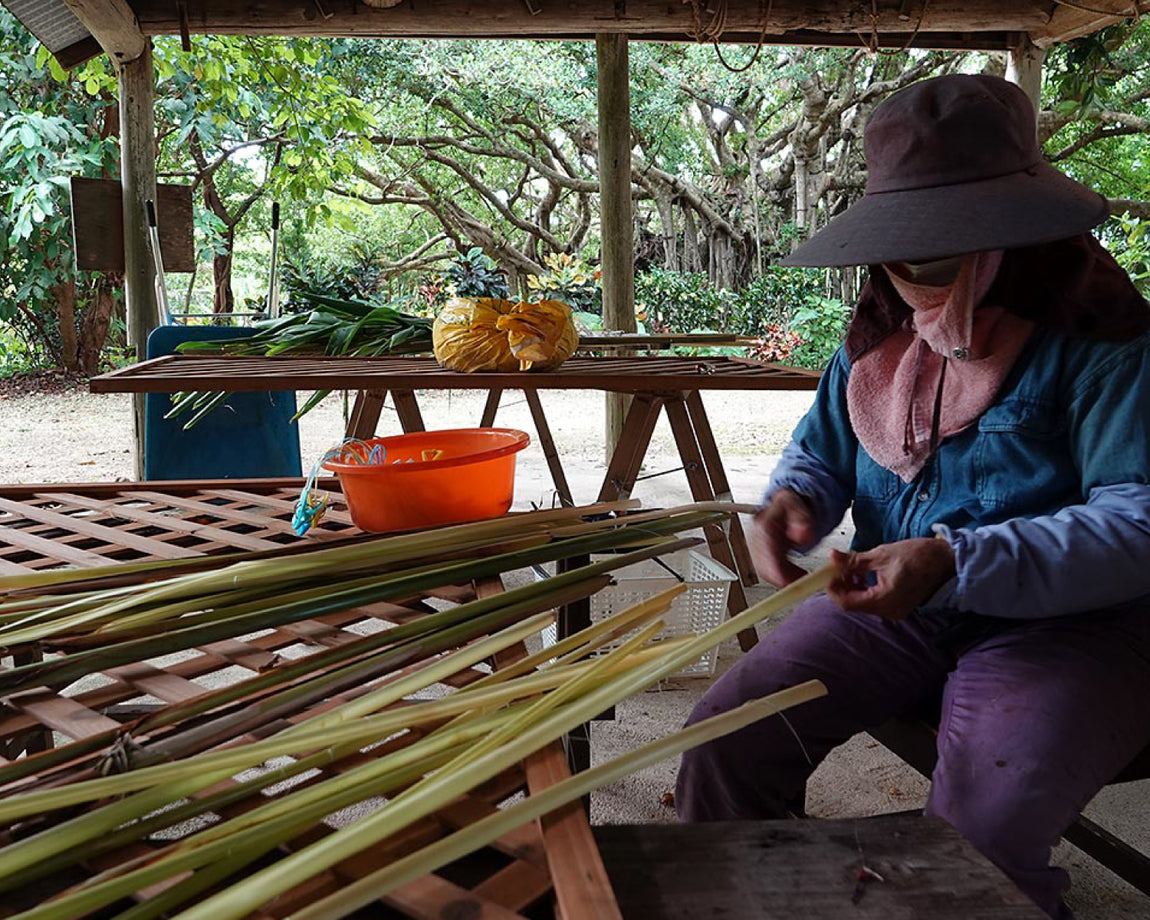 収穫した葉を天日干しで乾燥させたら、天候を伺い、曇りや小雨の日に編み込み作業を行います。月桃は湿度の影響を受けやすく、ある程度湿気を含んでいるしなやかな状態が手編みには最適なのです。収穫から材料作り担当の2名、手編み担当の4名、近所の社会福祉センターの方々と分業しながら、自然との向き合い方も含めて、暮らしに根付く民具作りを地域全体で大切に語り継いでいます。