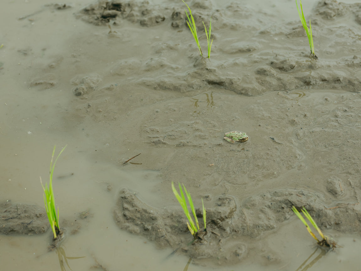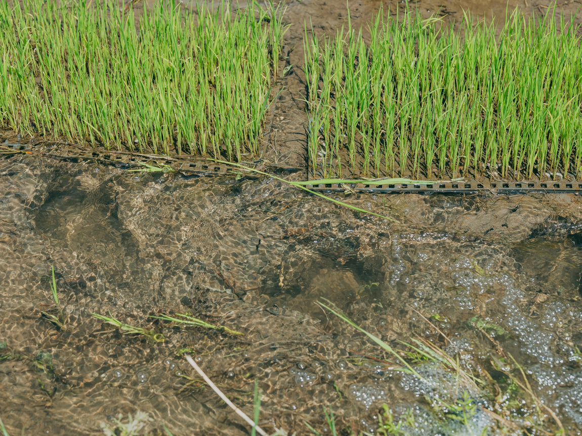山からの地下のパイプを通ってきた湧き水をそのまま田んぼに引くのではなく、周りの水路を経由させ、水に陽が当たり虫や植物などの多様な生態系に触れることで、水温を高めて光合成細菌などの微生物の働きを活発化。その水を小さな生き物たちとともに田んぼに取り入れることで、微生物が光合成で蓄えた窒素が土壌に撹拌・分解され、稲が自然に逞しく育つための糧となっています。