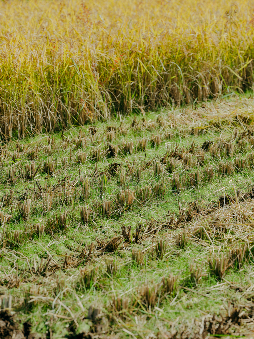 荒生さんは、江戸時代の中打ち八へん農法をはじめとする無農薬・無肥料の多収米栽培の研究で博士号を取得した農学博士。自然の循環に委ねるところは委ね、抑えるべきポイントを見極め、自然栽培が当たり前だった頃の術を学びながら実践と応用を14年続けています。栽培をはじめた初期は背の高さにばらつきがありましたが、自家採種を重ねるうちに環境に馴染んで同じ背丈に育つようになりました。