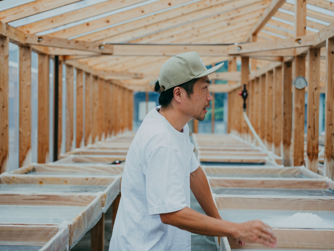 気象条件などを見極めながら、365日。1〜2時間ごとに塩を手作業で攪拌すること夏季3ヶ月、冬季6ヶ月。じっくりと時間をかけ、ミネラルを損なわないようにゆっくりと様々な感覚を使い、会話するように結晶化させます。塩作りの中でも最も手間と時間がかかる完全天日塩製法では一切火を使いません。さらに小坂さんの製法では、塩作りで一般的な濃縮システムを使わずに、海水の濃縮を結晶ハウスの中だけで行います。そうすることで塩の味や結晶の形や大きさ、ミネラルの含有量をコントロールすることが可能になるからです。徹底した管理によって生まれる繊細な味は過度に塩味が立つことがなく、穏やかでほのかに甘みさえ帯びています。 まずは蒸し野菜やおむすび、卵料理などシンプルに塩の旨みを味わってみてはいかがでしょう。