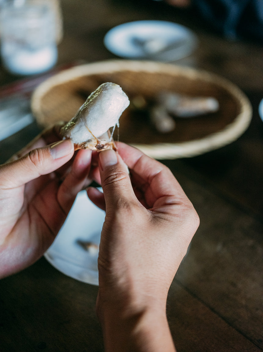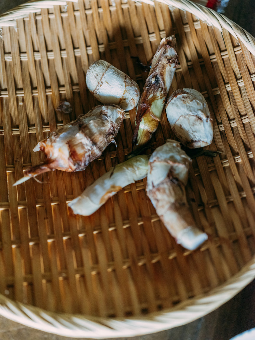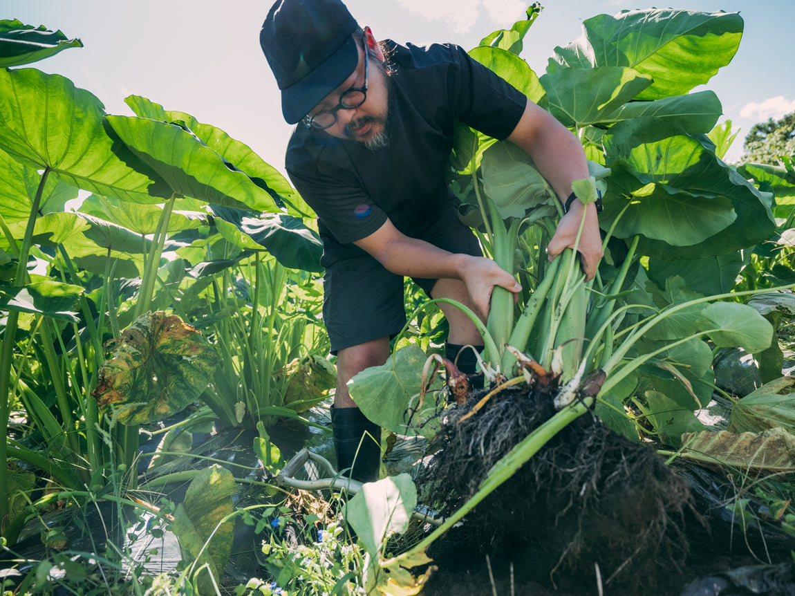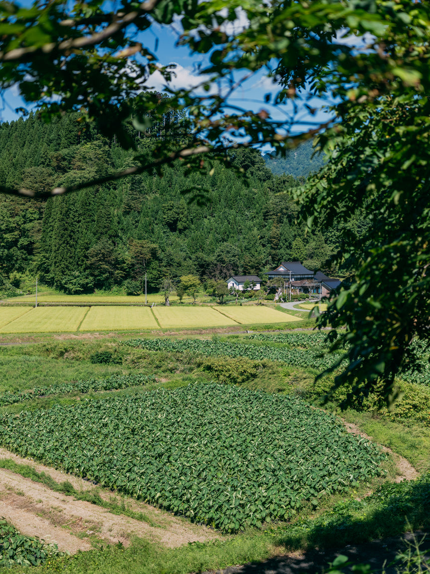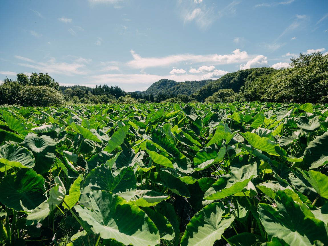 山形県最上郡真室川町は、雄大な山々が連なる豪雪地域最上地方の最北にある町。「甚五右ヱ門芋」は豊かな自然にあふれたこの町で、室町時代から代々受け継がれてきた伝承野菜です。100年以上続く佐藤家の家宝として伝わり、一般的な里芋より手間がかかりますが、品種改良することなく先祖が種継ぎをし続けて、守り抜いてきた一子相伝の里芋です。生産者の佐藤春樹さんの祖母が倉庫に保管していた20株の種芋を、月日をかけて大切に増やしていきました。