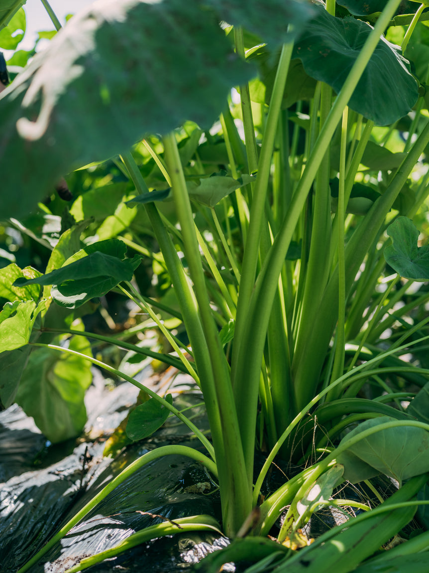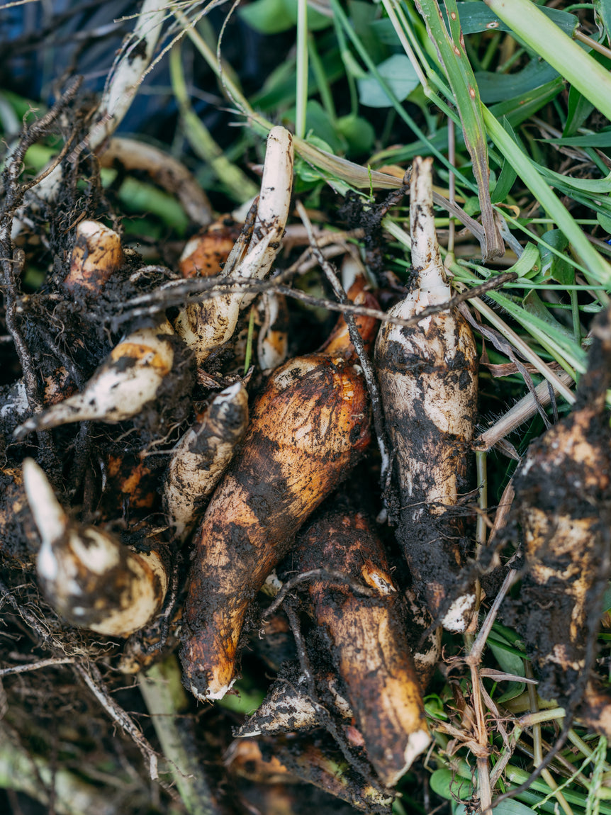 農薬・化学肥料不使用で栽培し、JAS有機認定の発酵鶏糞と牛糞堆肥、牡蠣殻石灰を使用。里芋は連作障害が起きやすいので、無農薬・無肥料のそばの栽培との輪作で栽培しています。里芋は種芋を植えて、その小芋、孫芋を食用とするのですが、ひとつの種芋から親芋が1つ、小芋が6つぐらい、孫芋が20〜30個と、土の中で上に向かって成長していきます。