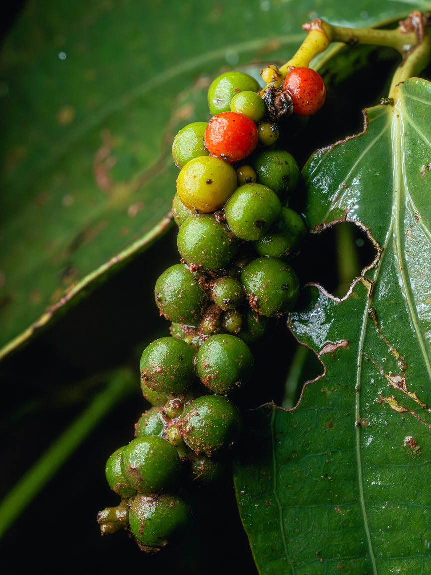 「カンポットペッパー」として栽培されているのは、古来より受け継がれてきた古来種である「クメール種」。日本で一般的なインド・スリランカ産の「インド種」や、マレーシア・ベトナムの「マレー種」と比べ、病気に弱く育ちも遅い上に収量もごくわずかという、決して効率的とはいえない品種です。ただ、軸から実の長さが短く、ぎゅっと詰まった粒は風味が濃く、辛味成分も平均より20%も多いと言われています。口に入れると、まず感じるのはツンとした刺激ではなく、炒りたてのスパイスのような香ばしい香りがふわりと広がります。さらに特徴的な旨味は、胡椒の実自体に濃厚な味わいがあるクメール種ならでは。炒め物やチャーハンなど火を通す料理はもちろん、サラダやカプレーゼといった生の料理で胡椒本来の風味を楽しむのもおすすめです。