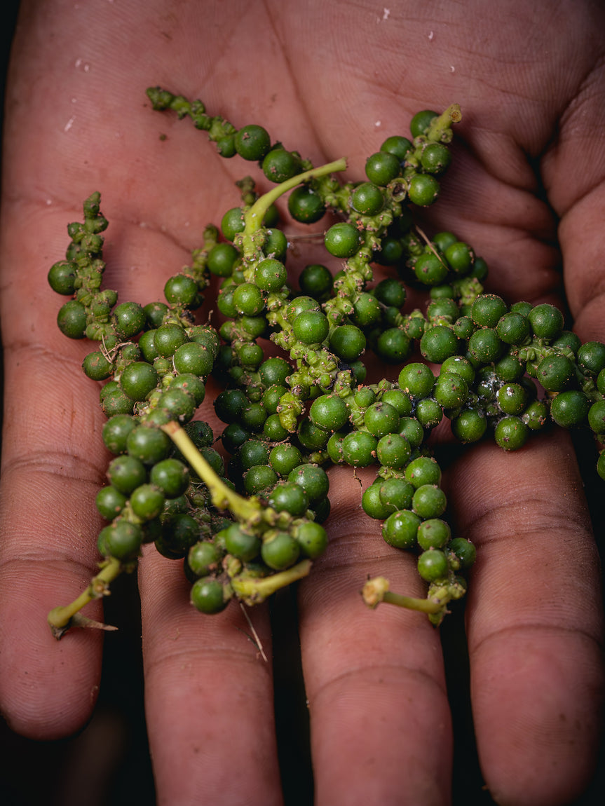 カンボジア・カンポット州で100年以上守られてきた伝統的な有機農法で育つ、希少な古来種の胡椒「カンポットペッパー」。海風と霧が運ぶ湿気、ミネラル豊富な赤土という特別な環境で実る胡椒は、世界流通量のわずか0.01%にも満たない貴重な存在です。農薬を使わず、自家製の有機肥料で丁寧に育てられた実は、時間をかけて旨味を蓄え、一粒ずつ手作業で選別されます。クメール種ならではの豊かな香りとフルーティーな旨味は、肉料理やカルボナーラなどの濃厚な料理にひと振りするだけで素材を引き立ててくれる存在。サラダやチーズなどのシンプルな一皿では、胡椒がメインにもできるほど香りと旨味がある未体験の胡椒です。