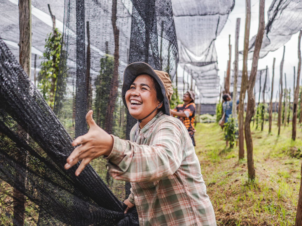 霧を生み出す山々に囲まれた地形や潮風の届く立地などの恵まれた環境だからこそ育つ「カンポットペッパー」ですが、100年以上前から受け継がれてきた伝統的な有機農法も、そのおいしさの秘訣です。農薬や化学肥料を使わず、カンポット特有のミネラル豊富な赤土で栽培しています。パイナップルやサトウキビ、牛糞などを混ぜ合わせた“秘密のレシピ”が受け注がれてきた自家製の有機肥料を、適切な量とタイミングで土に施すことで、虫がわかず、健康な木に育ちます。じっくりと味を濃縮させながら熟成した実は、一粒ずつ手作業で選別。積み重なった知見と手間暇によって生まれる、希少な胡椒です。