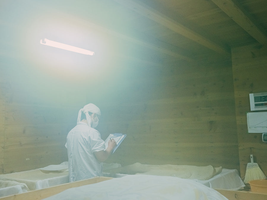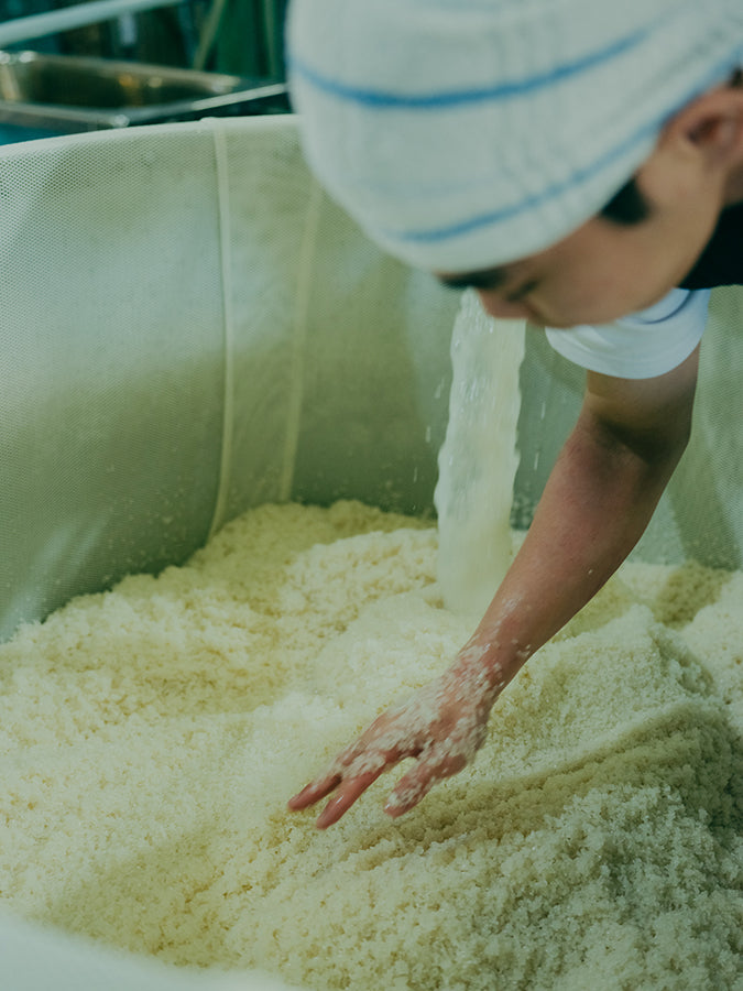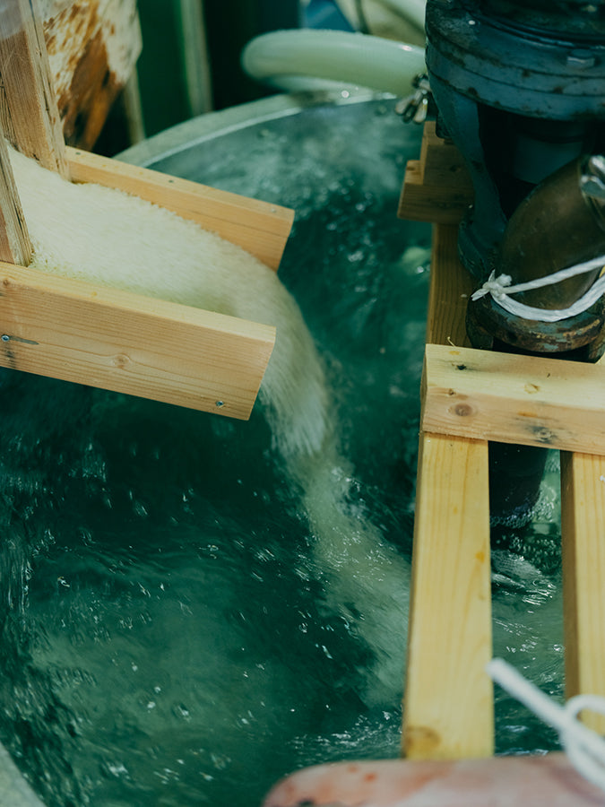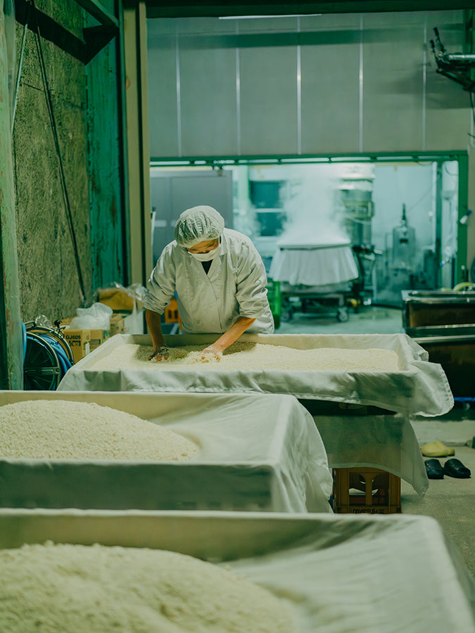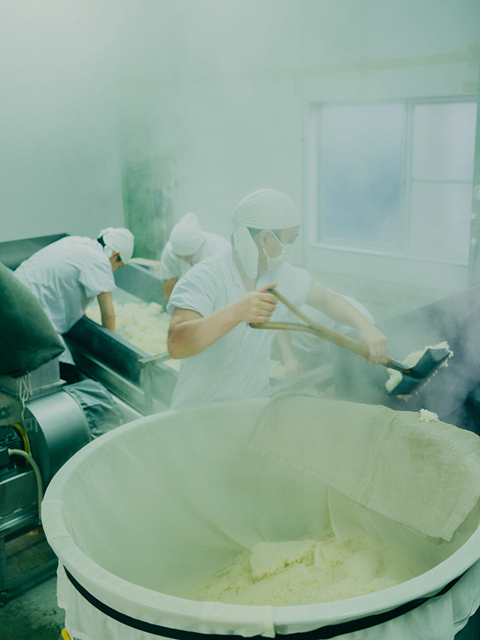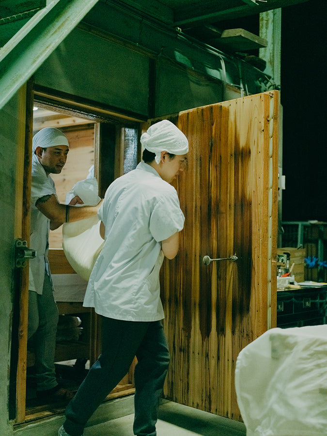 小笠原味淋醸造のみりん造りは掃除から。新入りさんはまず手洗いの仕方を教わり、春先に1ヶ月かけて天井や蛍光灯の裏、全ての道具を手分けして隅々まで磨き上げます。そうして清潔に保たれた室(むろ)の中で48時間手作業で米麹を造り、蒸したもち米と焼酎と合わせて自然の力だけで“みりん諸味”を発酵。それを搾って熟成させるという製法を100年以上変えることなく、職人の手によって先祖代々受け継いでいます。