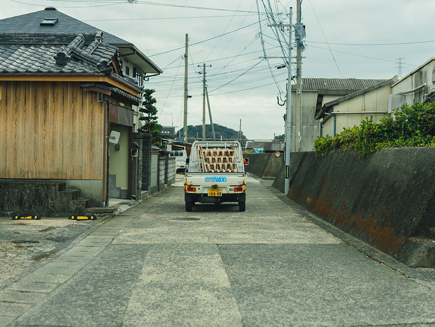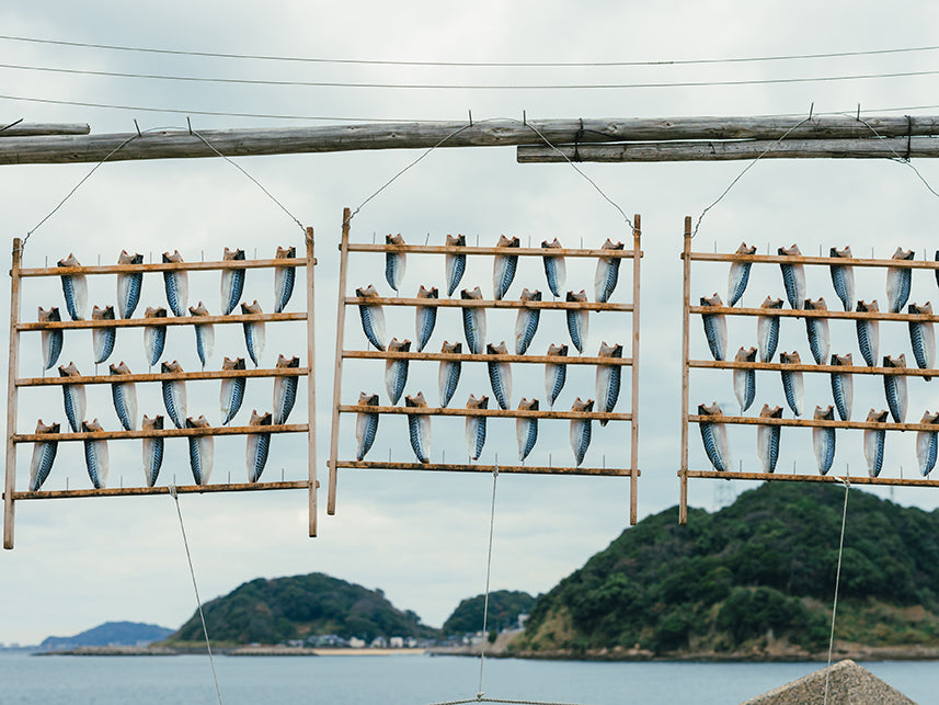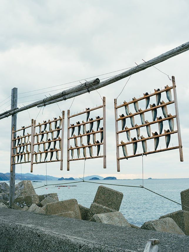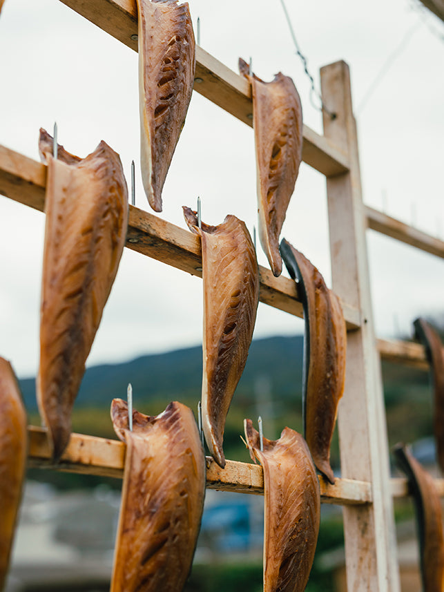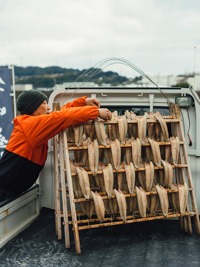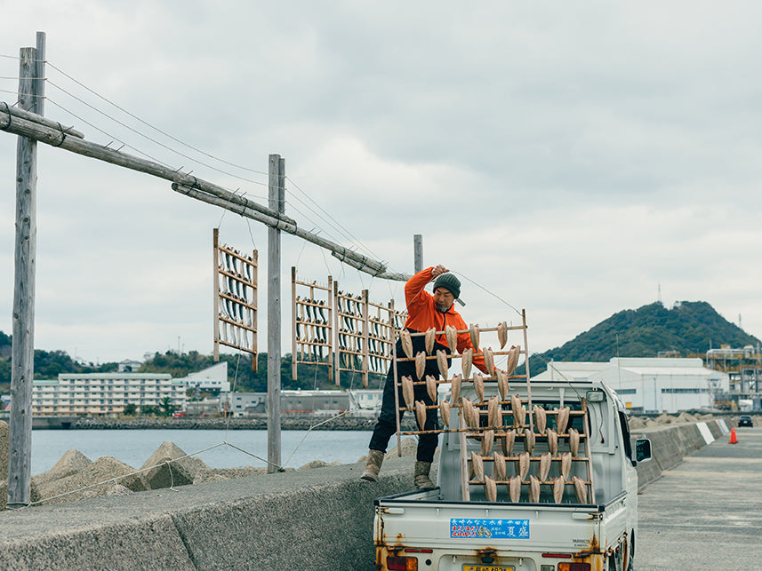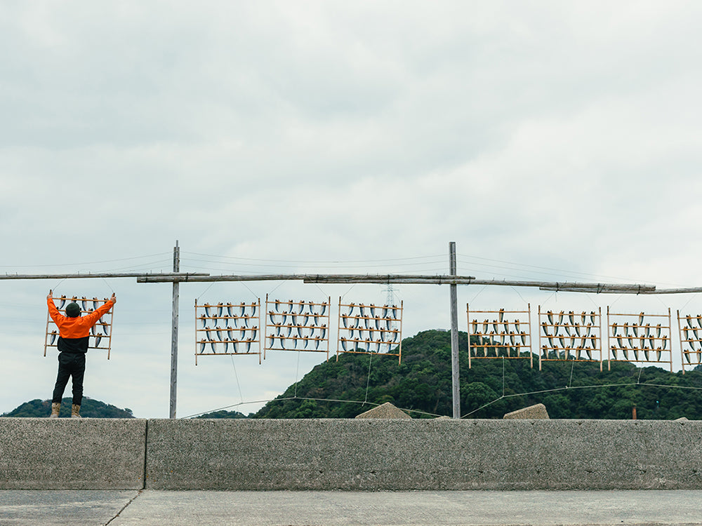 長崎市内から遠くない場所にありながら、車通りもほとんどない小さな港町の先端の埠頭に、目を疑うような昔ながらの干し場がある。360度が海に囲まれたその干し場には、東シナ海からの冷たい冬風が吹き注ぎ、遮るものなく天日が降り注ぐ。人工的な影響をほとんど受けないからこそ、自然環境がそのまま味になったような、長崎のおだやかな気候をたっぷり含んだ、おいしい天日干しに仕上げることができる。