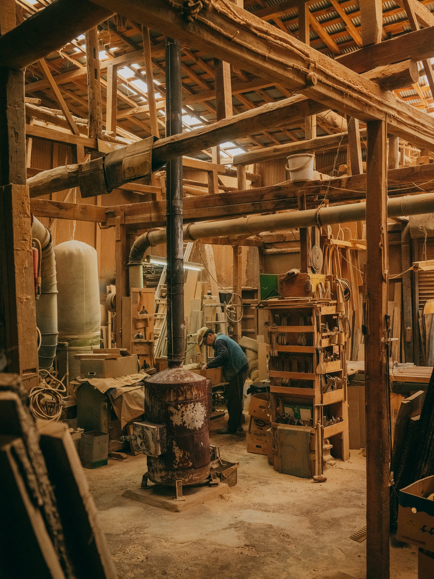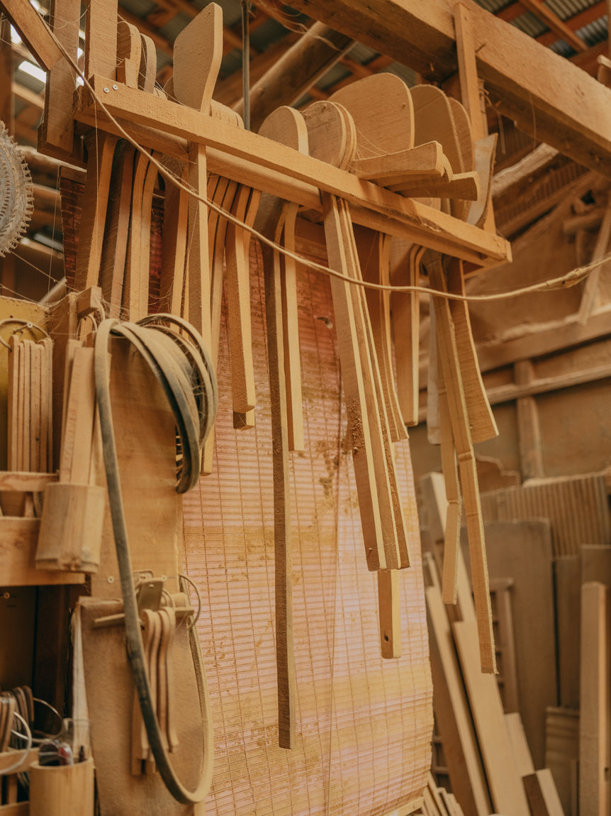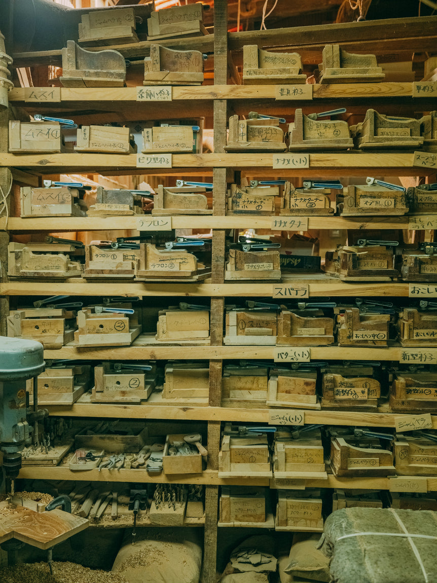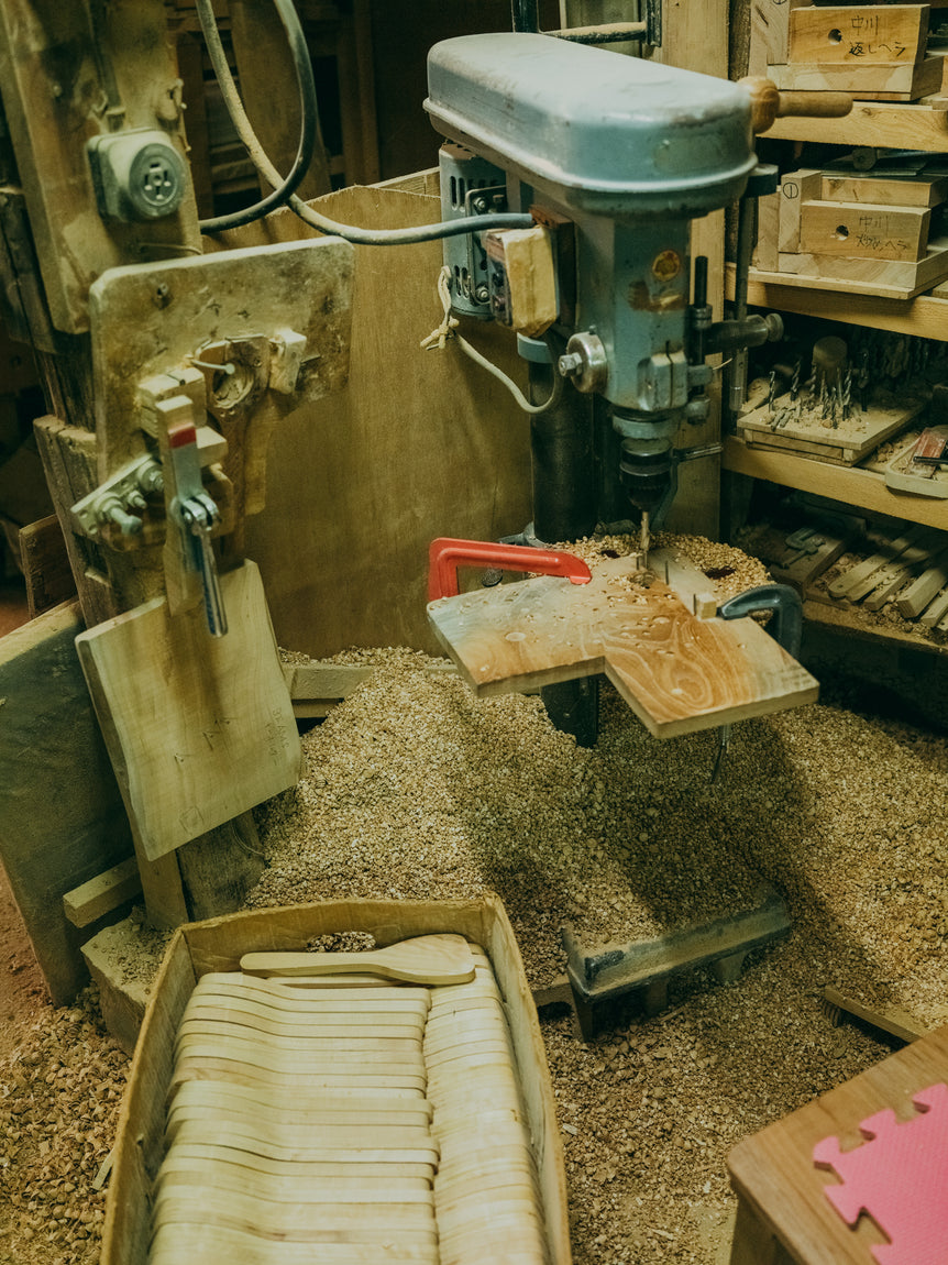 木工技術の限界にチャレンジし続けた130年 明治時代の創業から続く長い歴史の中で、宮島工芸は木材加工の伝統を守りさらに進化させていくために、様々な加工技術に挑戦してきました。欧米からカトラリーが輸入されると、バターナイフやヘラ、ハサミなどを木工で再現できないかとその形状や製法を徹底的に研究。そうして培われた類まれな立体加工の技術は、宮島工芸のチャレンジ精神の象徴とも言えます。この杓子作りには、角盆作りで確立した技法や型が応用されており、機械製造では再現できないなめらかで有機的な曲線を安定的に生み出しています。